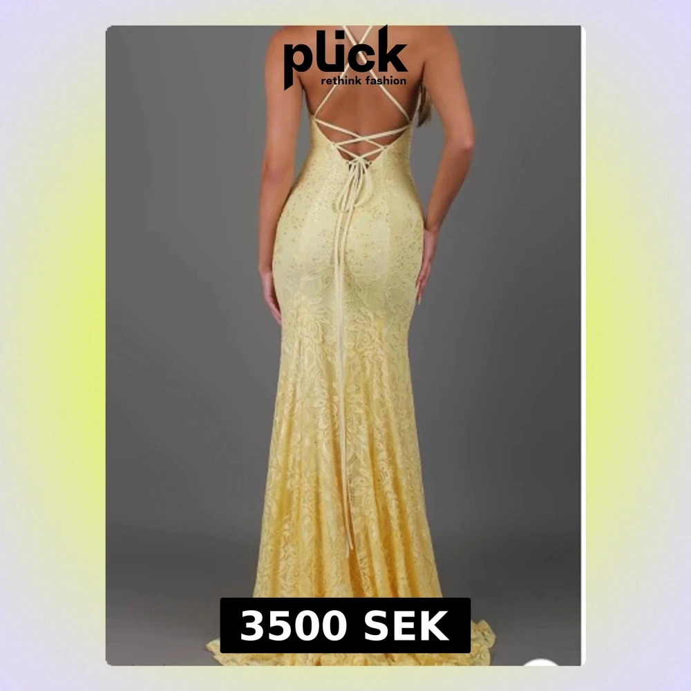 Elegant gul långklänning med spetsdetaljer och figurnära passform. Klänningen har v-ringning, öppen rygg med korsad snörning och tunna axelband. Perfekt för bal eller sopistikerade tillfällen. Materialet känns lätt och luftigt. Endast använd en gång, släpet är därför jätte jättelitet smutsigt men inget som syns