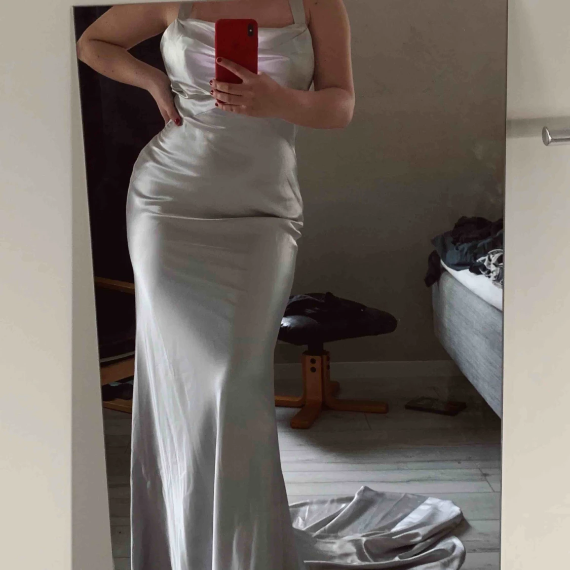 Silvrig balklänning med släp, aldrig använd. Ca M/L lite oklart då det inte står någon storlek i klänningen. Köpt för 1700 kr på Lizandliz.com. Frakt på 58 kr tillkommer.