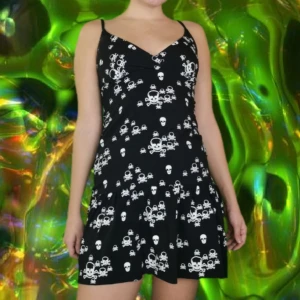 SĂ„ söt kortkort klĂ€nning med dödskalle-mönster. Storlek S/M men Ă€r mer som en small endast. Frakt för denna ligger pĂ„ 44 kr, samfraktar gĂ€rnađđ