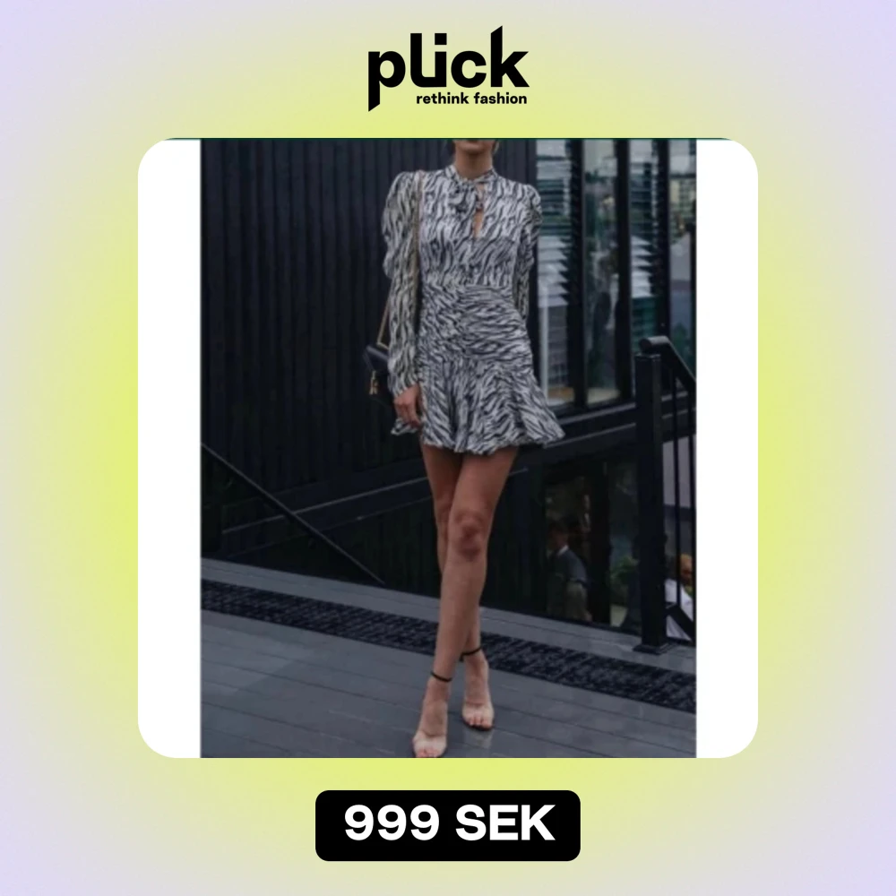 En vacker chiffong klänning med zebramönster och långa ärmar. Klänningen har en djup V-ringning och en knäppning framtill samt band upp till man kan knyta eller låt vara hängandes. Stängs med dragkedja i ryggen. Skick: Som ny! Endast använd en gång