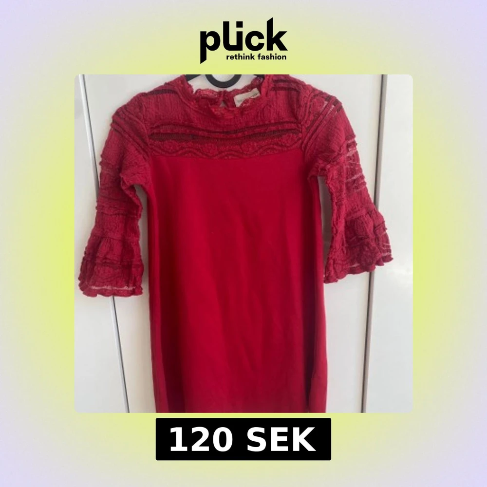 Säljer en röd klänning med vackra spetsdetaljer upptill och på ärmarna. Klänningen har trekvartsärmar med volanger och en rak passform. Perfekt för dig som vill sticka ut med en färgstark look. Klänning är för barn runt 6års åldern
