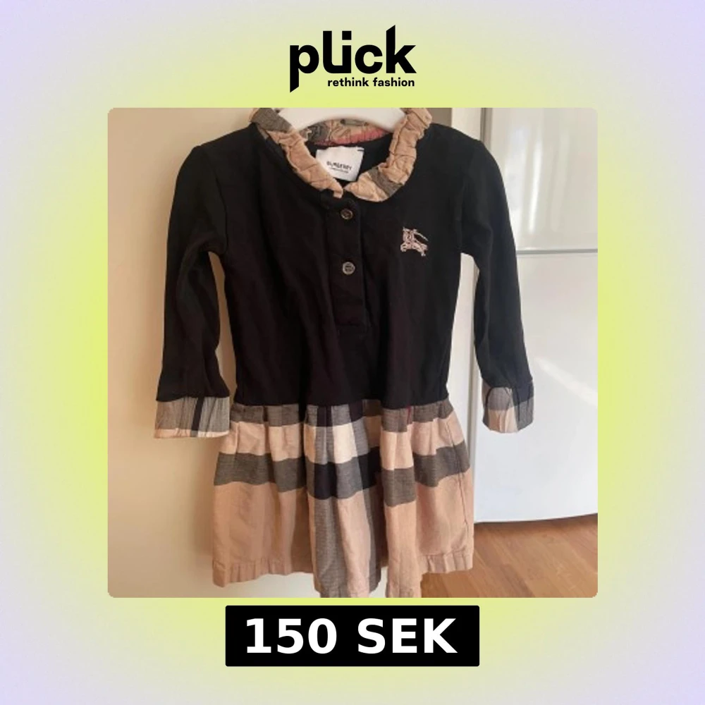 Säljer en söt svart och beige klänning från Burberry med rutigt mönster på kjolen och volangdetaljer vid kragen. Klänningen har långa ärmar och knappar framtill. Perfekt för en stilfull look! Storlek 74/80