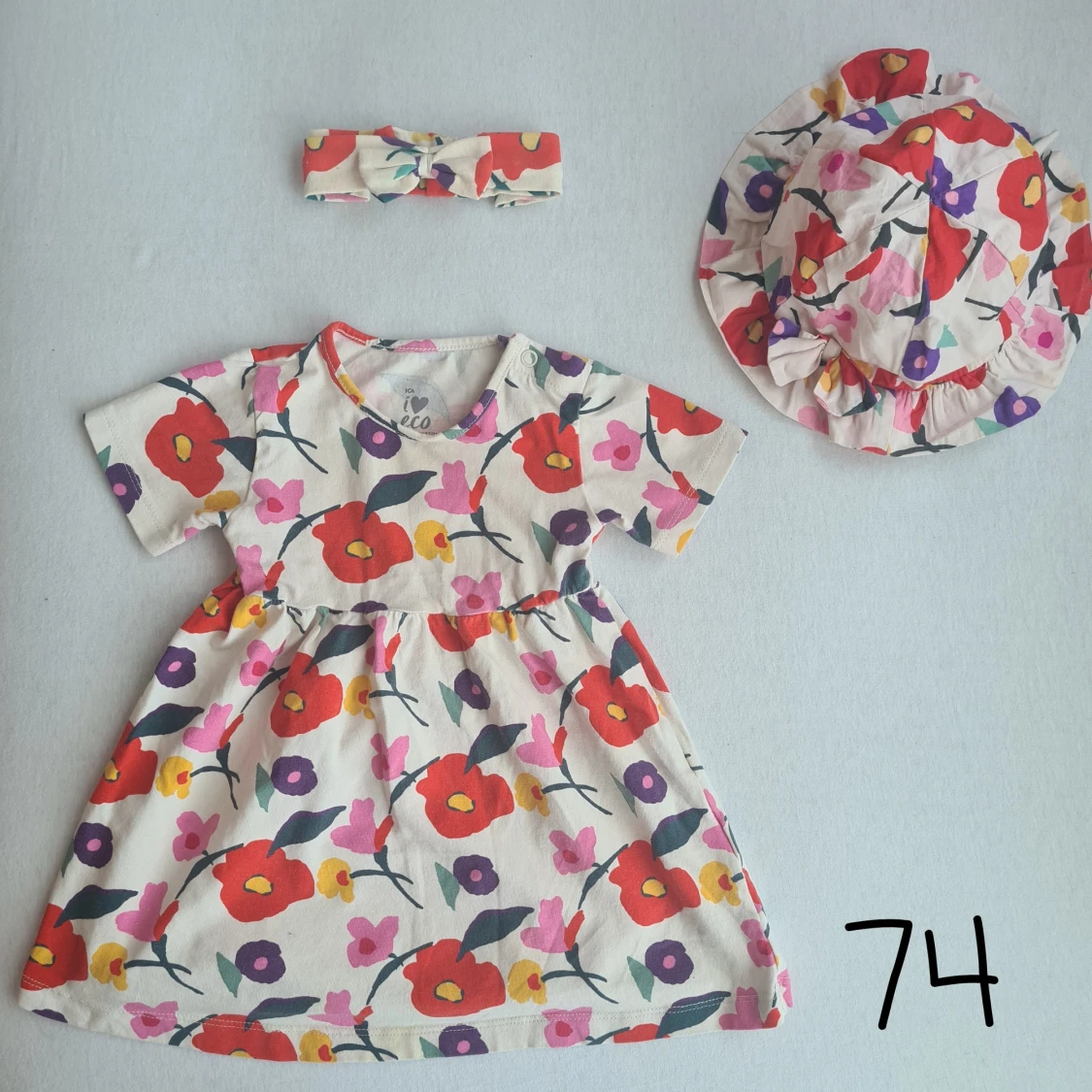 Blommig sommarklänning med solhatt och hårband i fint skick. Märket är ICAS I ❤ Eco.