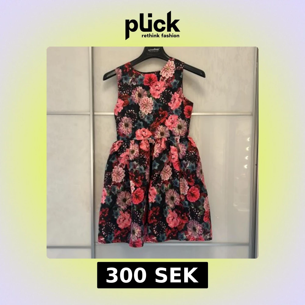 Blommig kortklänning från HM med färgstarka rosa, röda och lila toner mot svart bakgrund. Klänningen är ärmlös, har rund hals och markerad midja med ett utställt kjolparti. Dragkedja i ryggen för enkel påklädning.