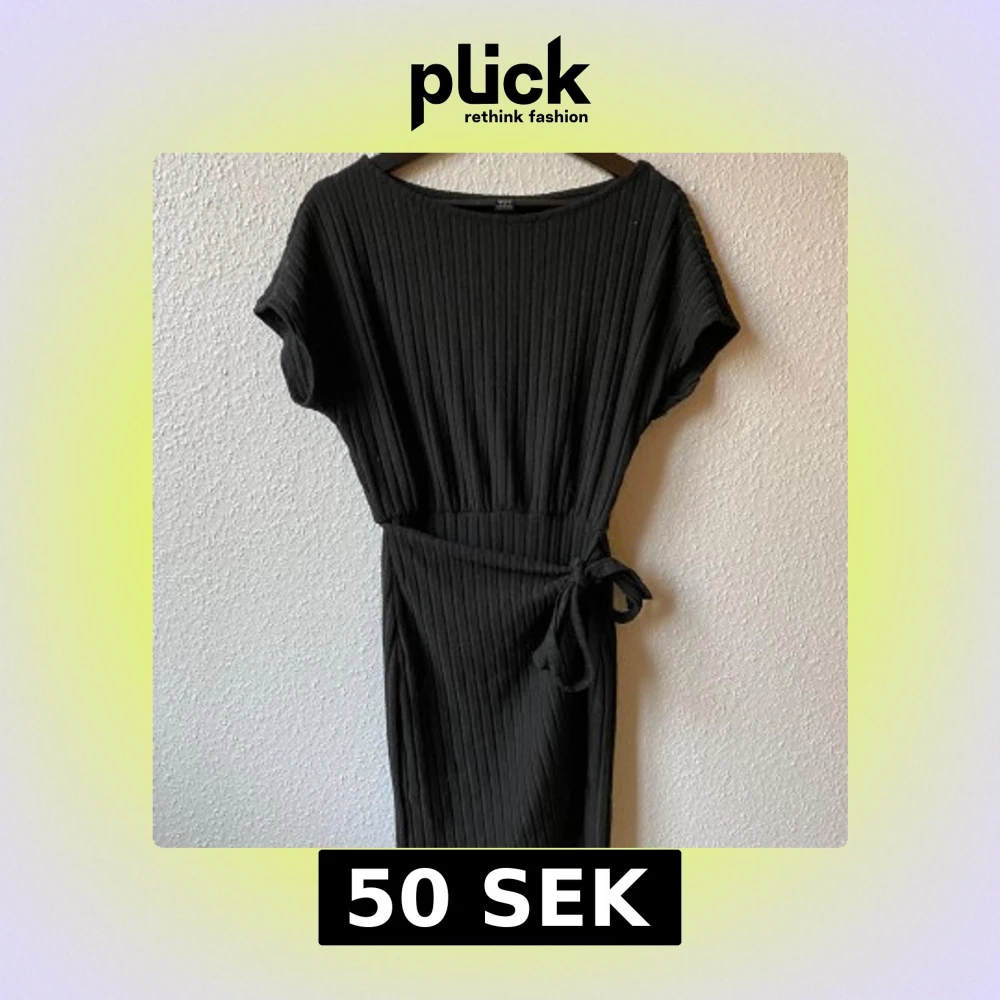 Snygg svart ribbad klänning med knytband i midjan. Den har korta ärmar och en enkel, stilren design som passar perfekt för olika tillfällen.