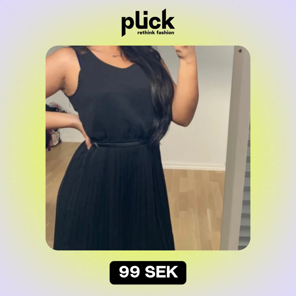 Svart klänning med svarta knappar där bak och skärp som ingår med klänningen. Har använts ungefär tre gånger. Storlek S men kan även användas för M.