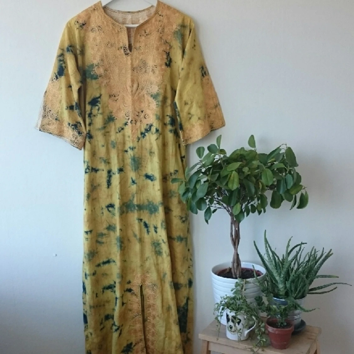 En otroligt fin klänningkaftan, köpt secondhand. Har själv aldrig använt den, men den är så himla fin så vill att den ska få komma ut och synas! Finns ett litet hål på baksidan vid fötterna, se bild 3.