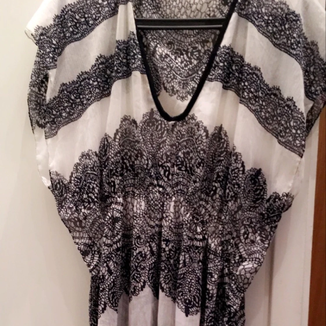 Vit spetsklänning med volangärmar - Superfin vit kortklänning i spets med blommigt mönster och volangiga axelband. Klänningen har en luftig och loose passform, perfekt för varma dagar. Söt och romantisk stil med v-ringning och detaljerade kanter. Ingen synlig dragkedja eller knappar.