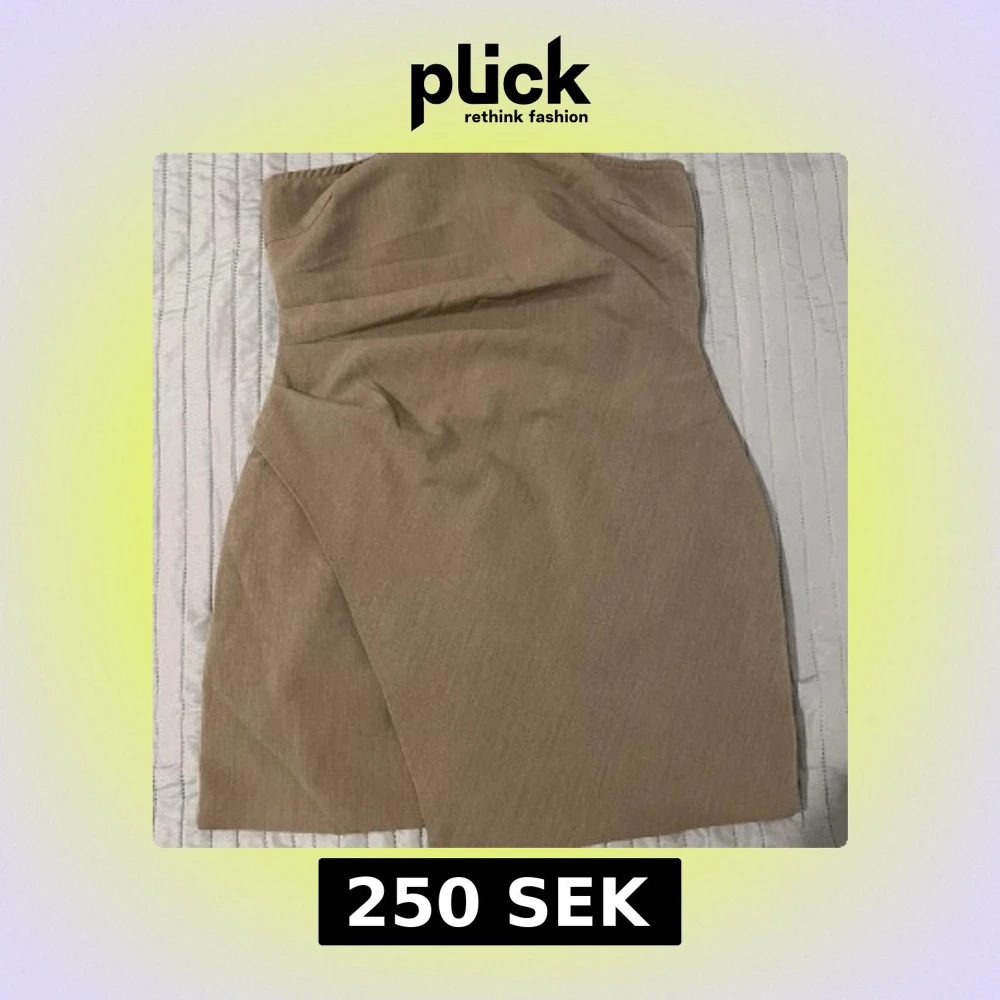 Snygg beige axelbandslös klänning från Boohoo med en stilren design. Klänningen har en dragkedja baktill för enkel påklädning och en elegant omlott-detalj framtill. Perfekt för en chic look!