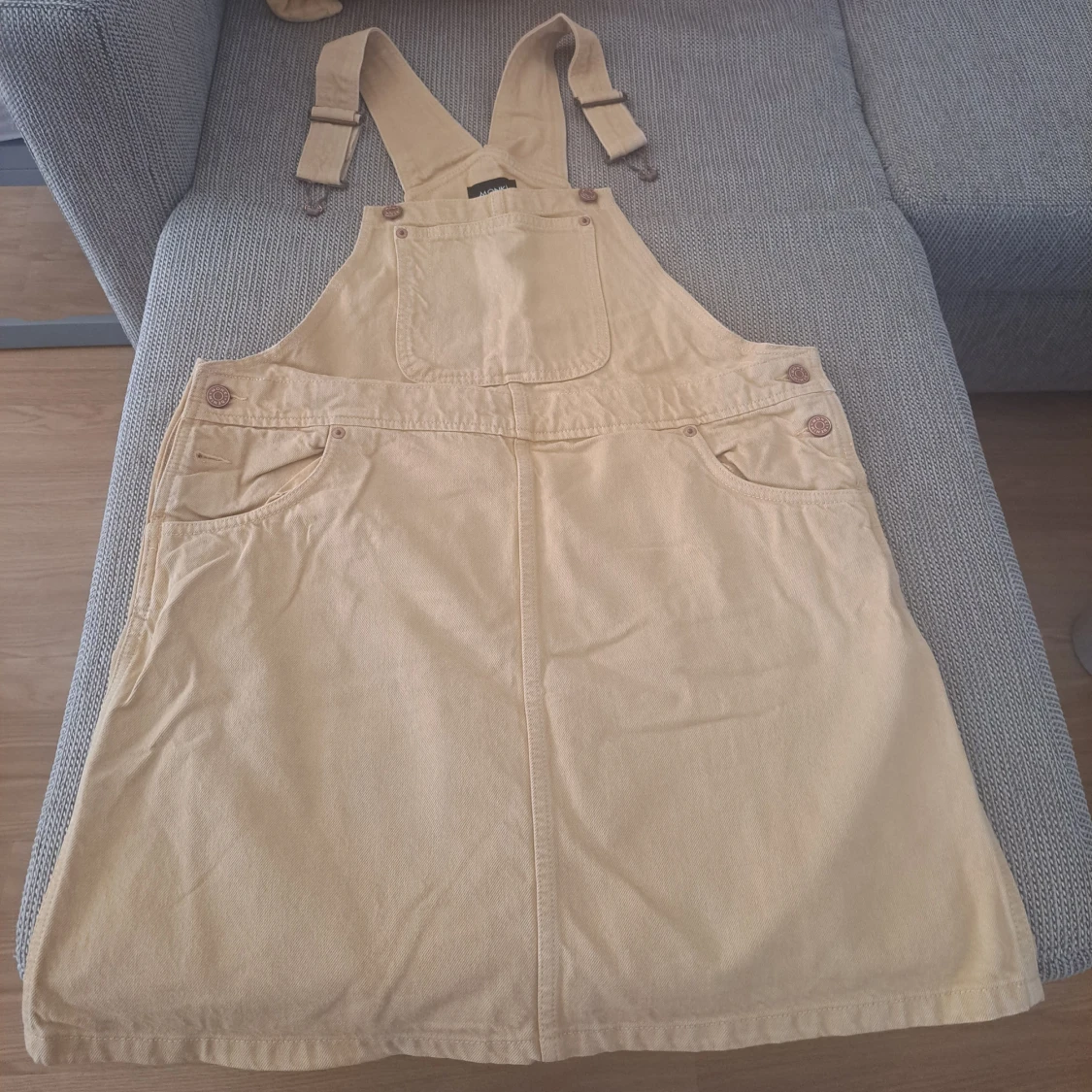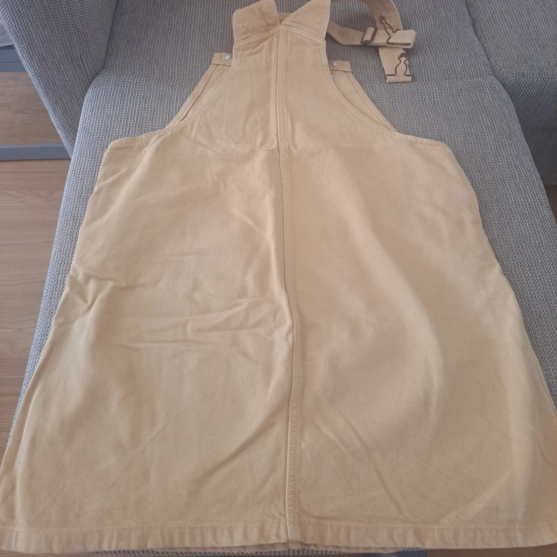 Supersöt beige hängselklänning i mjuk bomull med klassiska fickor fram och justerbara axelband. Perfekt för lager-på-lager och enkel att styla med t-shirt eller tröja under. Rak passform och praktiska knappar i sidorna.