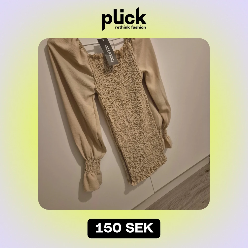 Säljer en superfin beige klänning från Boohoo i nytt skick. Den har långa ärmar med smockdetaljer vid ärmslut och en tight passform. Perfekt för höst och vår! Klänningen är gjord i ett mjukt material som känns skönt mot huden.