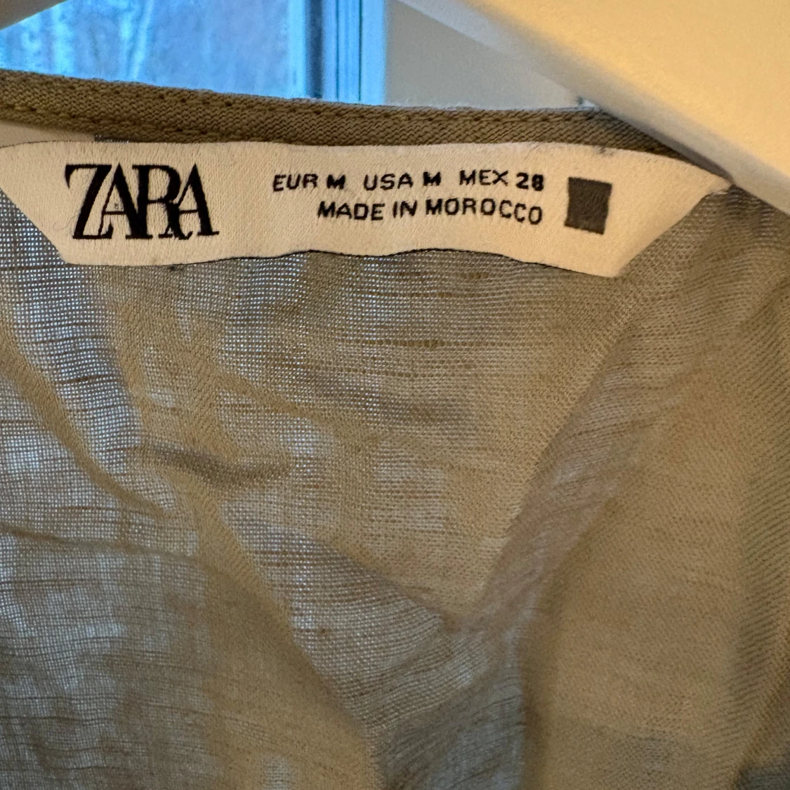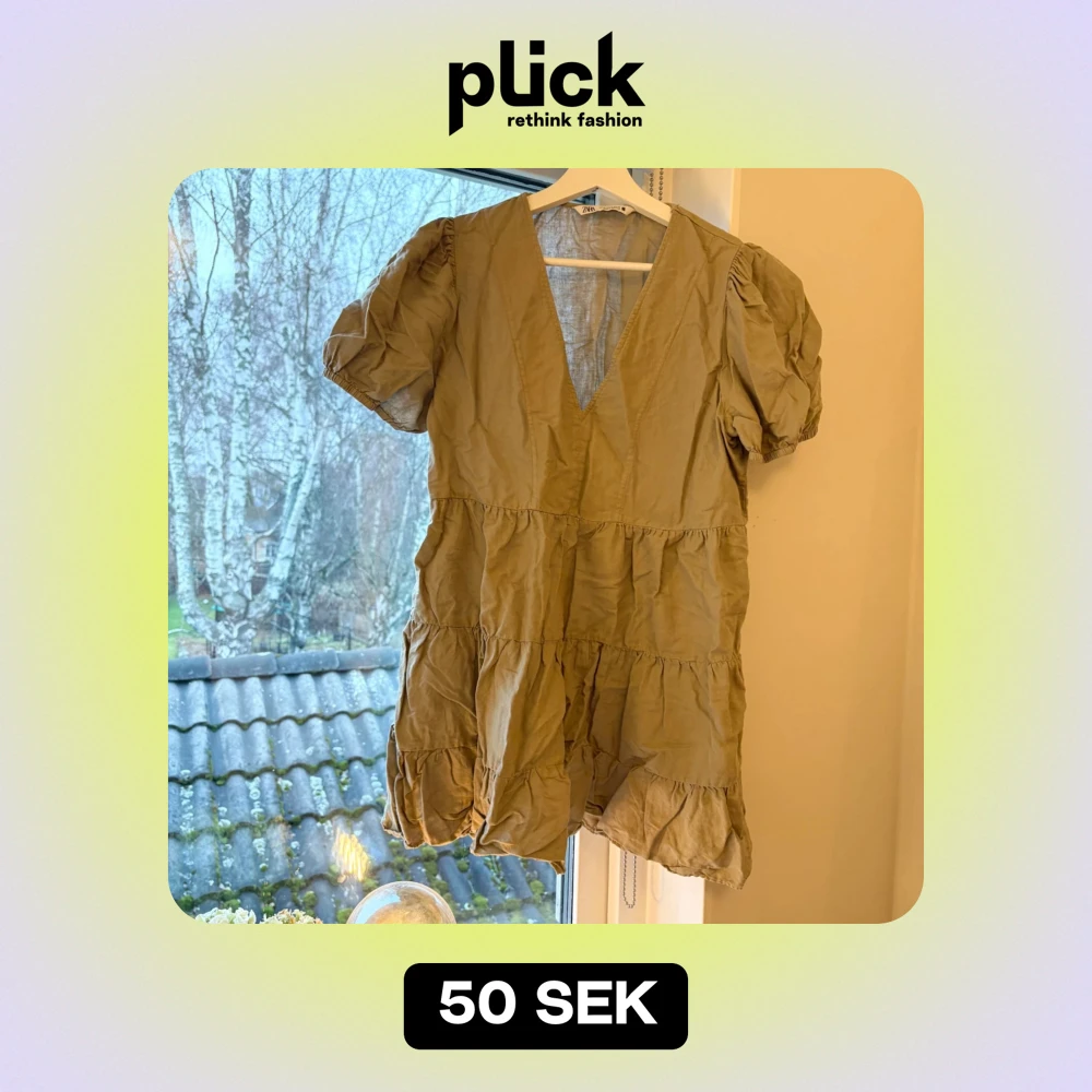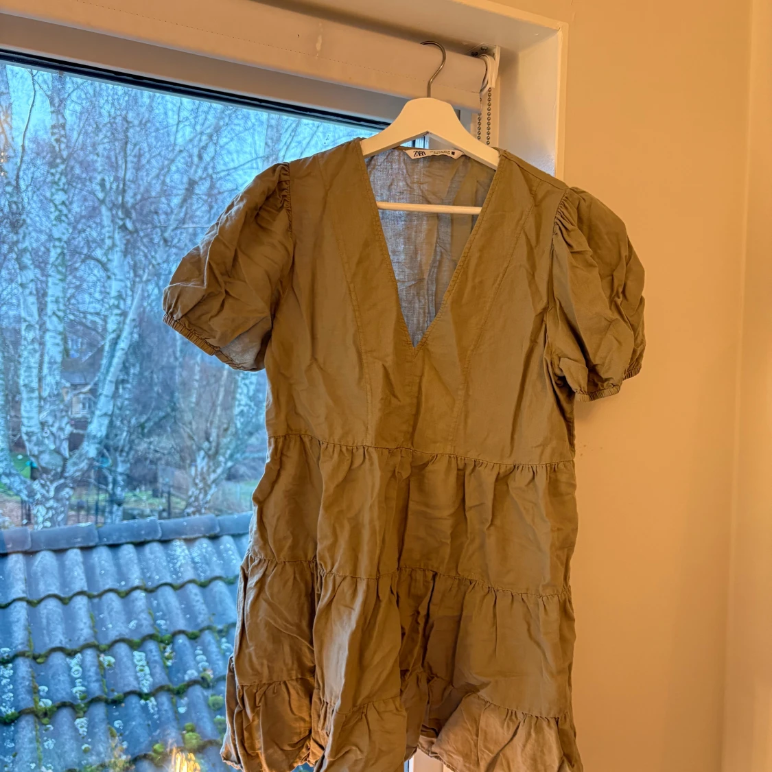 Säljer en superfin beige klänning från Zara i storlek M. Den har en v-ringad design med korta puffärmar🌼