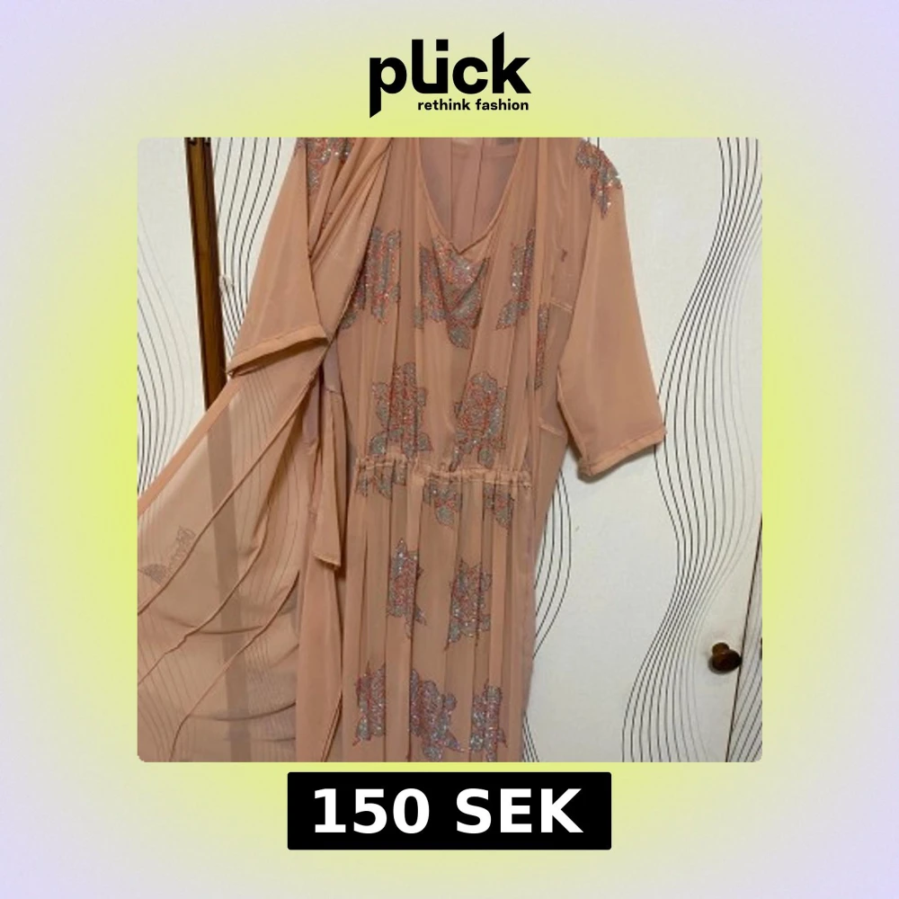 Elegant beige klänning med glittrigt mönster och v-ringad hals. Klänningen har kortärmade ärmar och en lös passform, perfekt för festliga tillfällen. Har använt den en gång och de va på ett bröllop