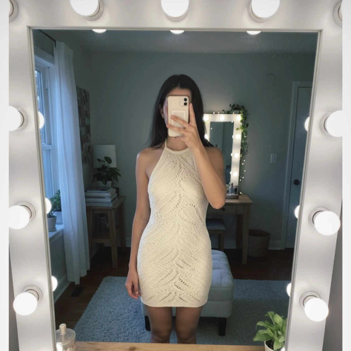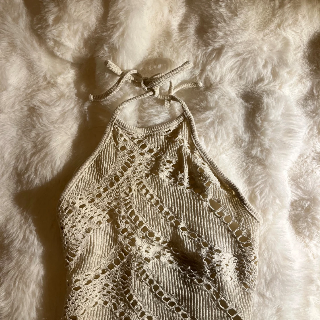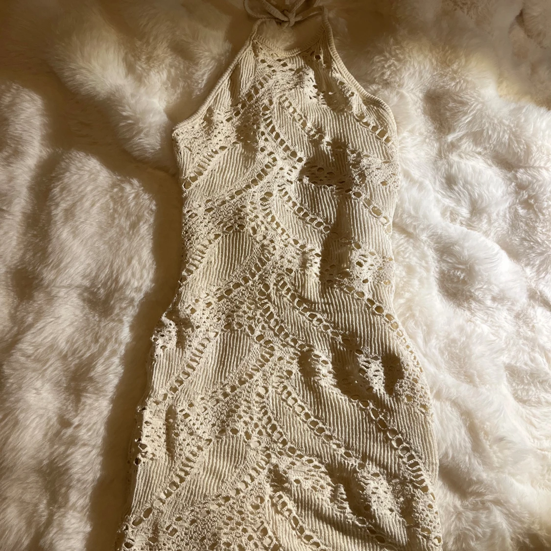 Säljer en superfin beige kortklänning med halterneck och snygg knytning i nacken. Storlek xs från bershka