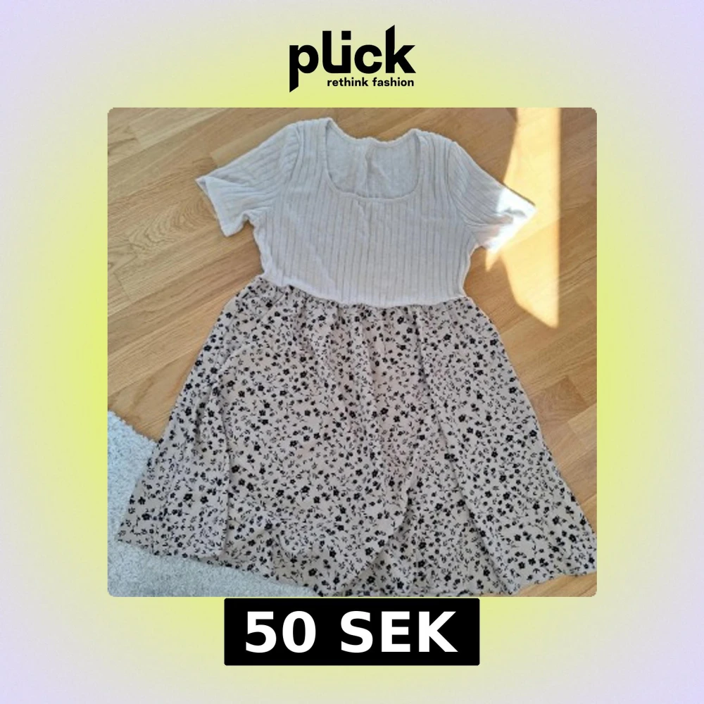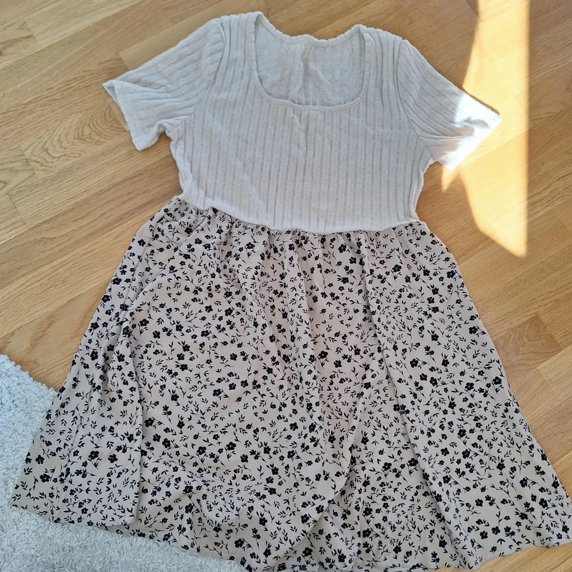 Supersöt beige kortklänning med ribbad överdel och rundad hals. Kjoldelen är i ett lätt, blommigt tyg med svart mönster som ger en romantisk vibe. Perfekt för vår och sommar! Korta ärmar och flowy passform gör den både bekväm och snygg.