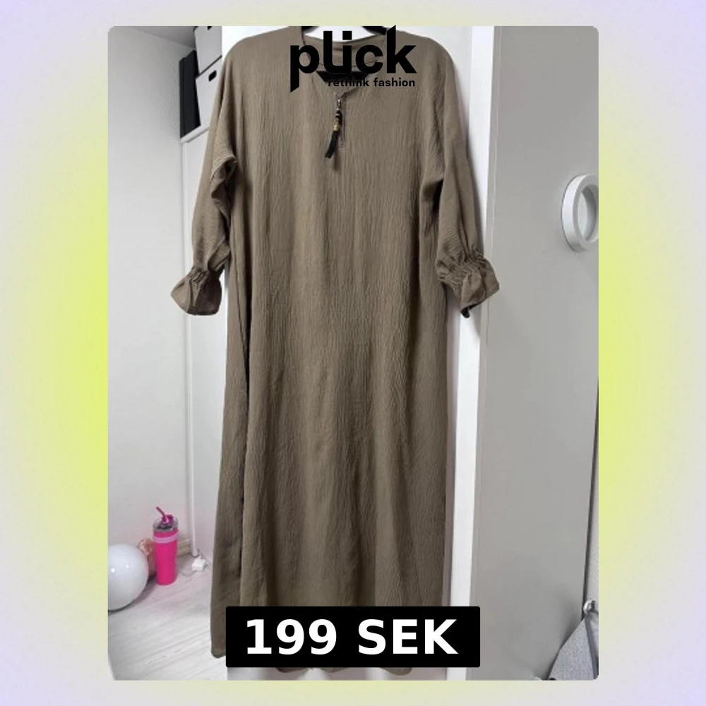 En enkel och stilren beige långklänning med trekvartsärm och lätt rynkad struktur. Klänningen har en rund halsringning och en dekorativ dragkedja framtill med tofsdetalj. Perfekt för dig som gillar avslappnad men snygg stil.