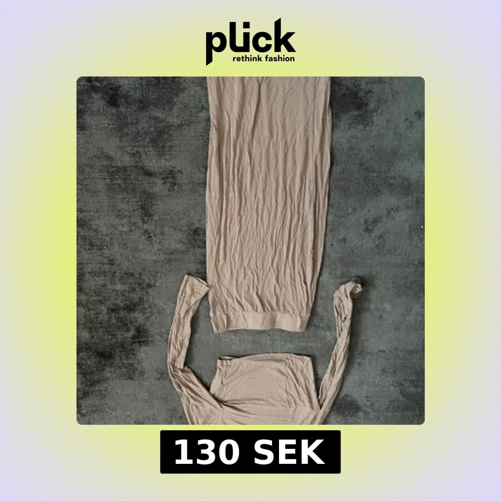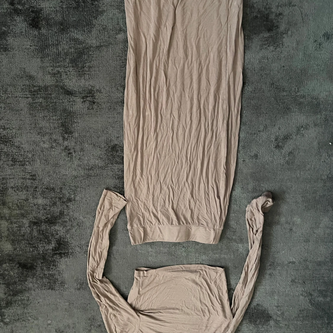Säljer en beige långklänning med långa ärmar. Klänningen har en enkel och stilren design med rund halsringning och är tillverkad i ett mjukt material som faller snyggt längs kroppen.