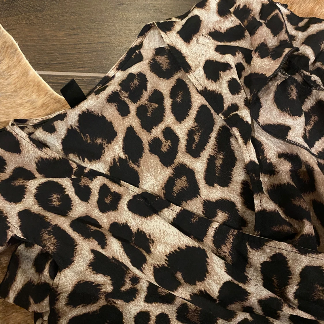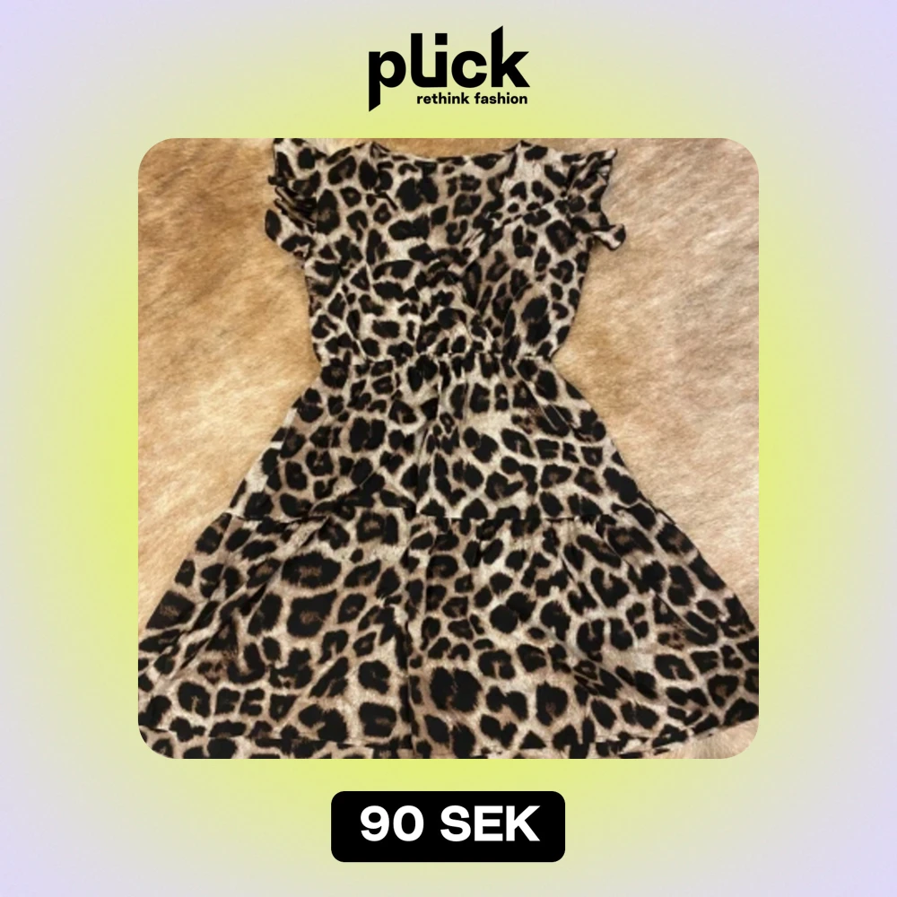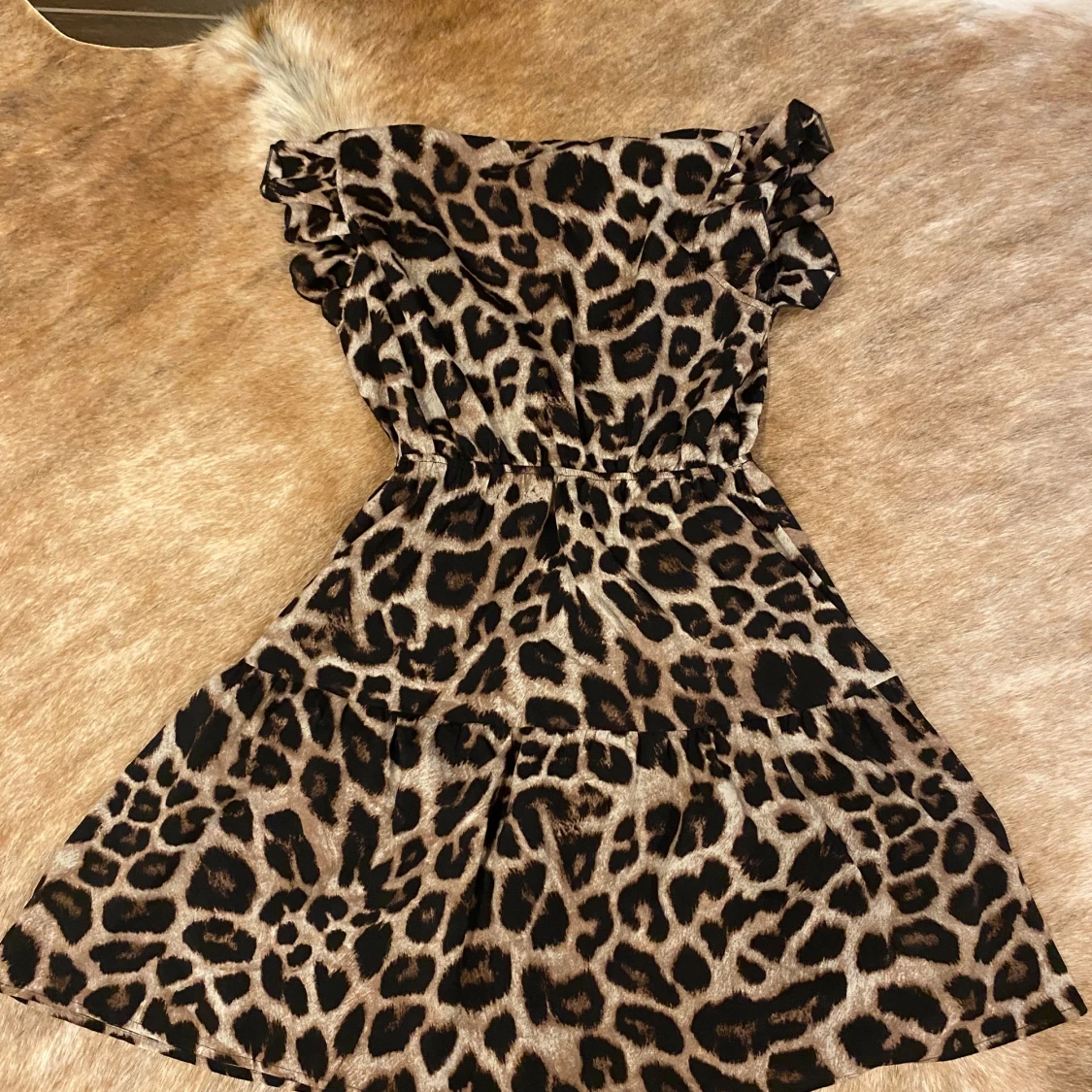 Säljer en supercool leopardmönstrad klänning med volanger på ärmarna. Den är kort och perfekt för en festlig kväll. Klänningen har en elastisk midja som ger en fin passform och är tillverkad i ett mjukt och bekvämt material.