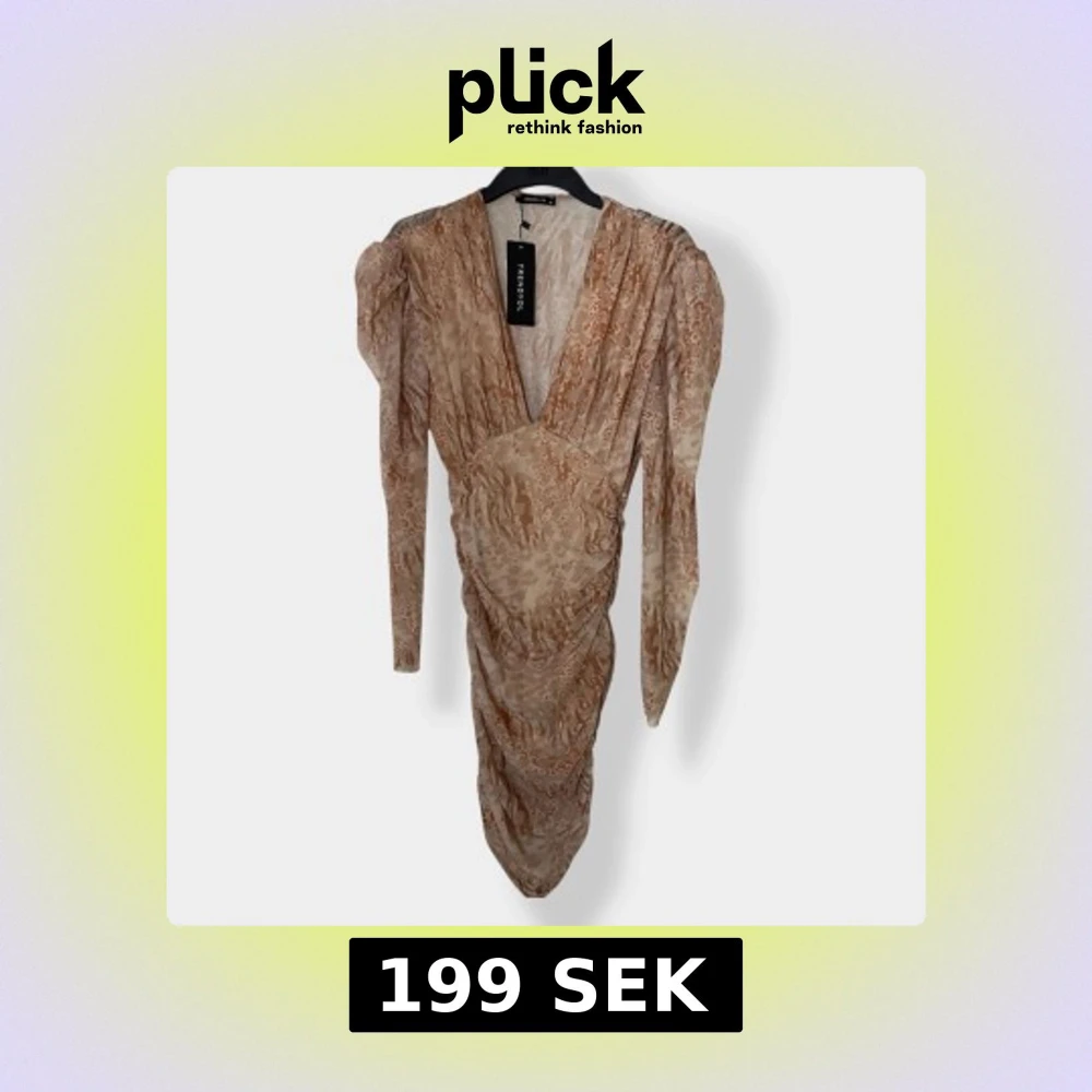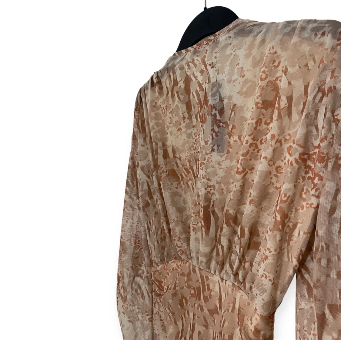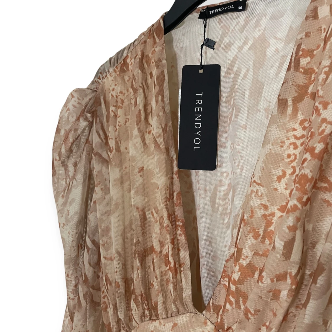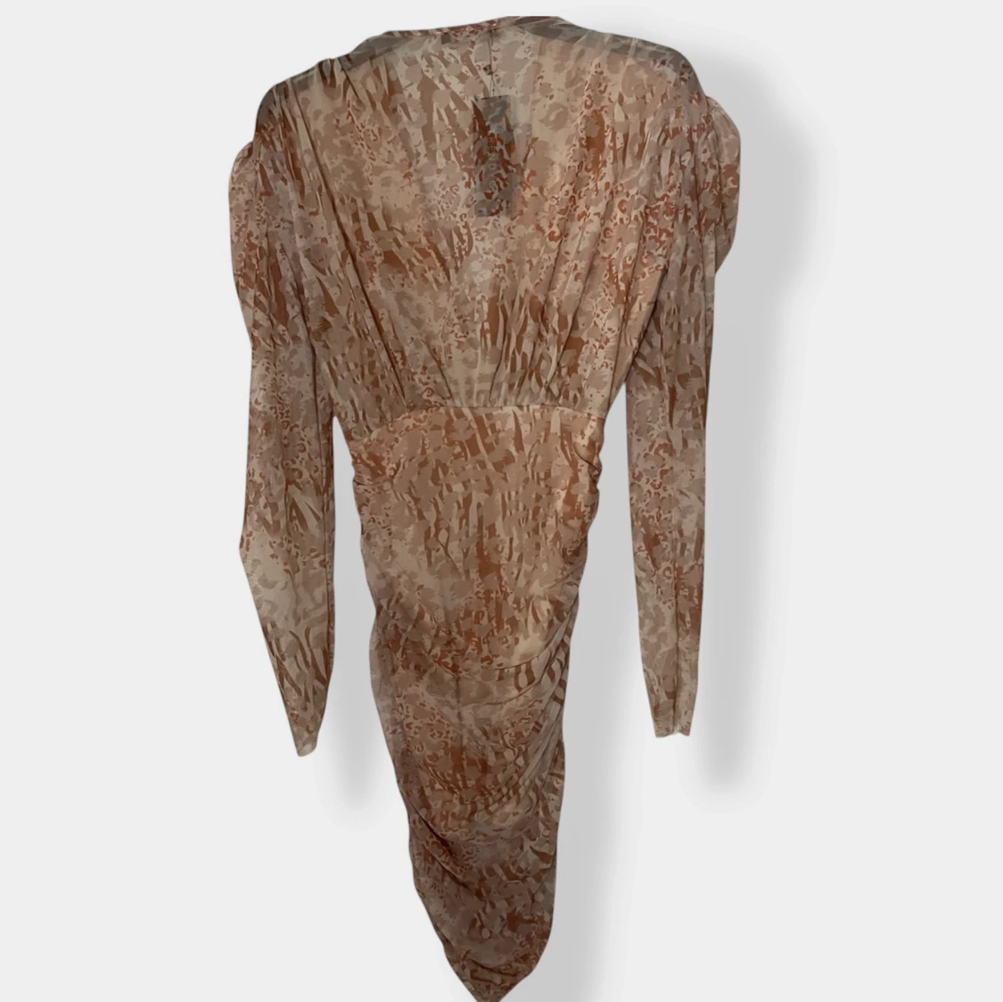 Supersnygg långklänning från Trendyol i beige och bruna toner med abstrakt mönster. Klänningen har v-ringning, långa ärmar med lätt puff och draperad effekt framtill. Tillverkad i ett lätt, flowy material som känns lyxigt och trendigt.