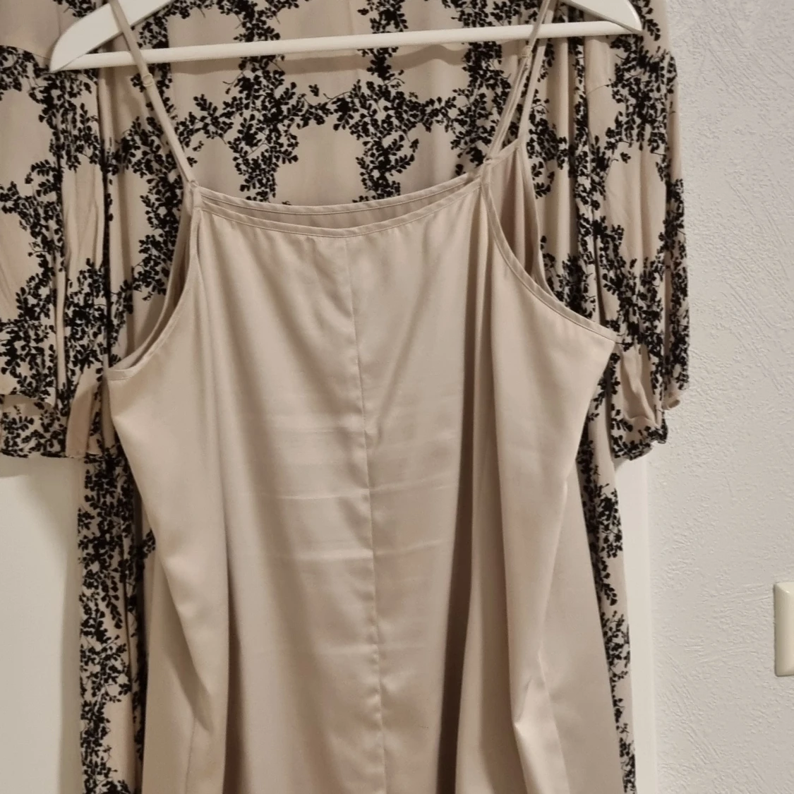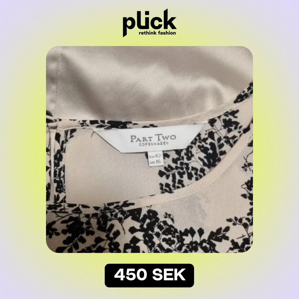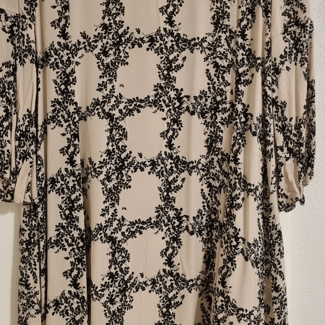 Säljer en elegant beige klänning från Part Two med ett vackert svart blommönster. Klänningen har trekvartsärmar och en lös passform, perfekt för både vardag och fest. Den kommer med ett matchande underklänning i beige. Materialet känns mjukt och lyxigt.