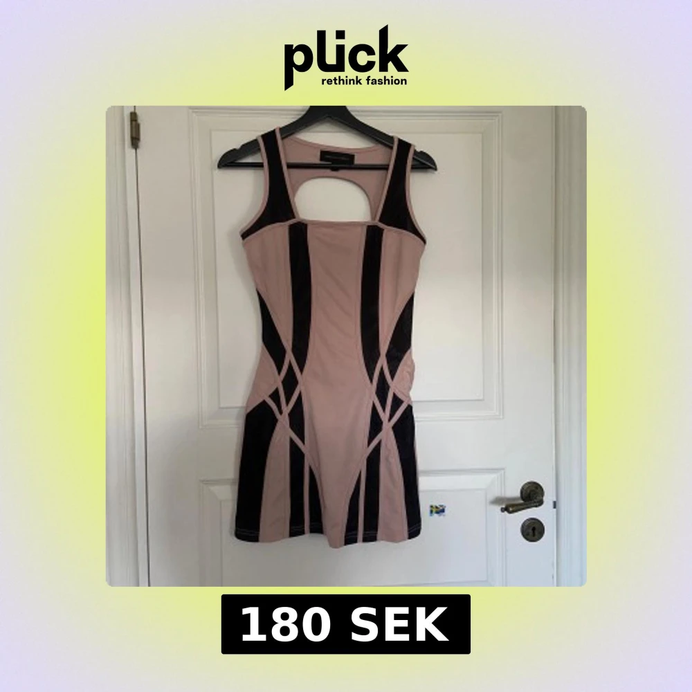 Säljer en snygg beige/rosa och svart kortklänning från House of Deréon. Klänningen har breda axelband, cut-out detalj i ryggen och grafiska svarta paneler framtill som ger en cool look. Perfekt för dig som vill sticka ut.
