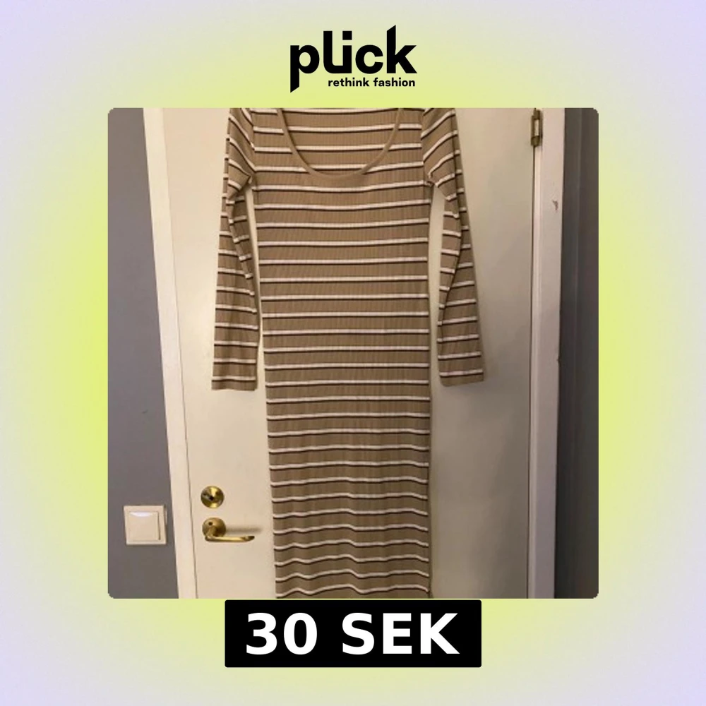 Superfin långklänning från 157 i ribbad beige och vit bomullsmix med svarta och bruna ränder. Klänningen har lång ärm, rundad ringning och sitter figurnära. Perfekt för dig som gillar en enkel men snygg stil.Frakt ingår inte