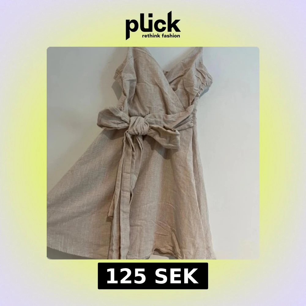 OBS! Väldig dåliga bilder kan skicka hur den sitter på. Beige kortklänning i linne med omlottmodell och stor knytrosett i midjan. Klänningen har smala axelband som är justerbara och v-ringad urringning, perfekt för varma dagar. Lätt och luftig känsla med dragkedja i ryggen.
