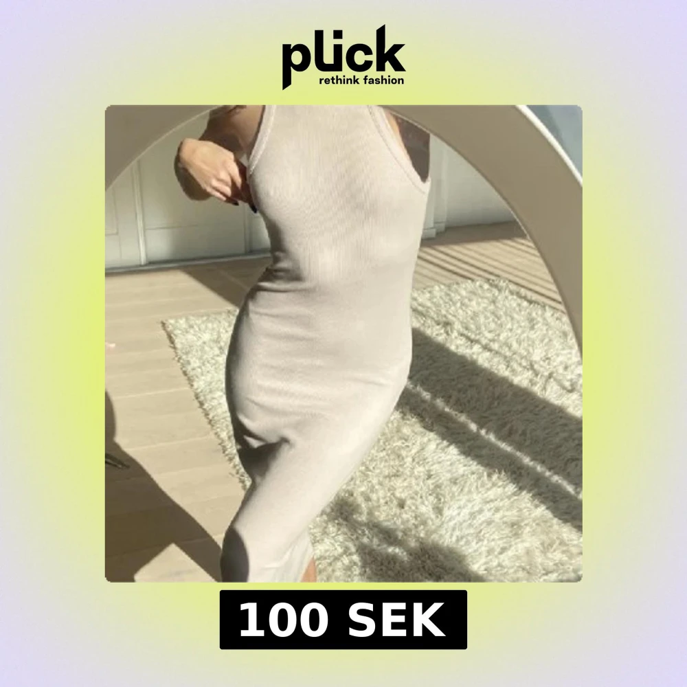 Snygg beige ribbad klänning med en tight passform och ärmlös design. Perfekt för en stilren look. Klänningen har en v-ringad hals och når ner till vaderna.