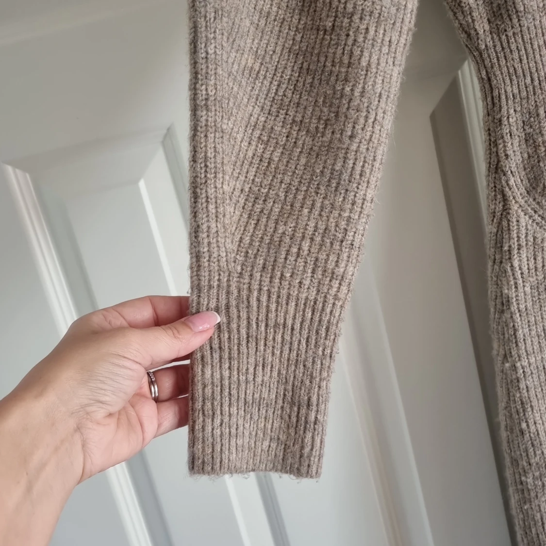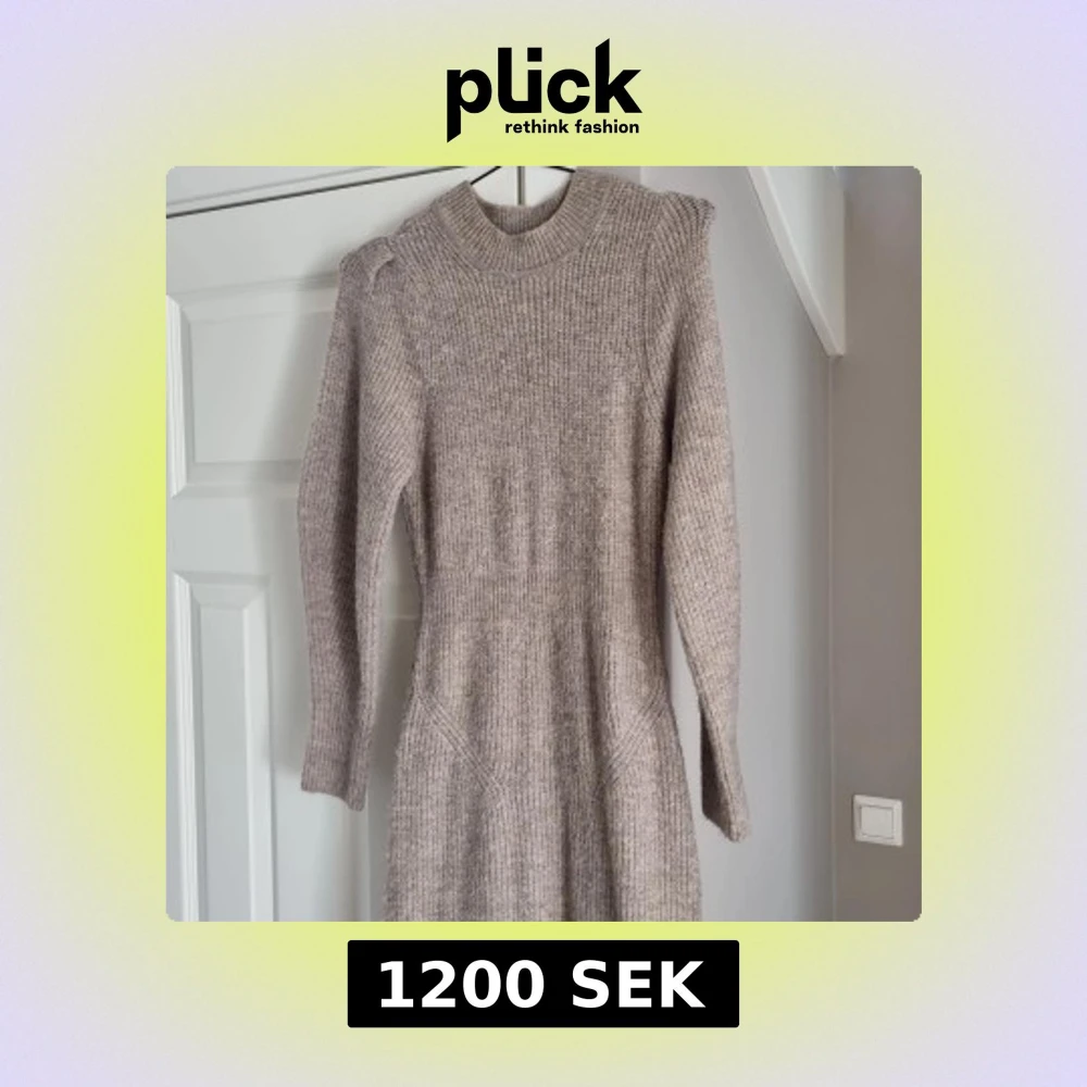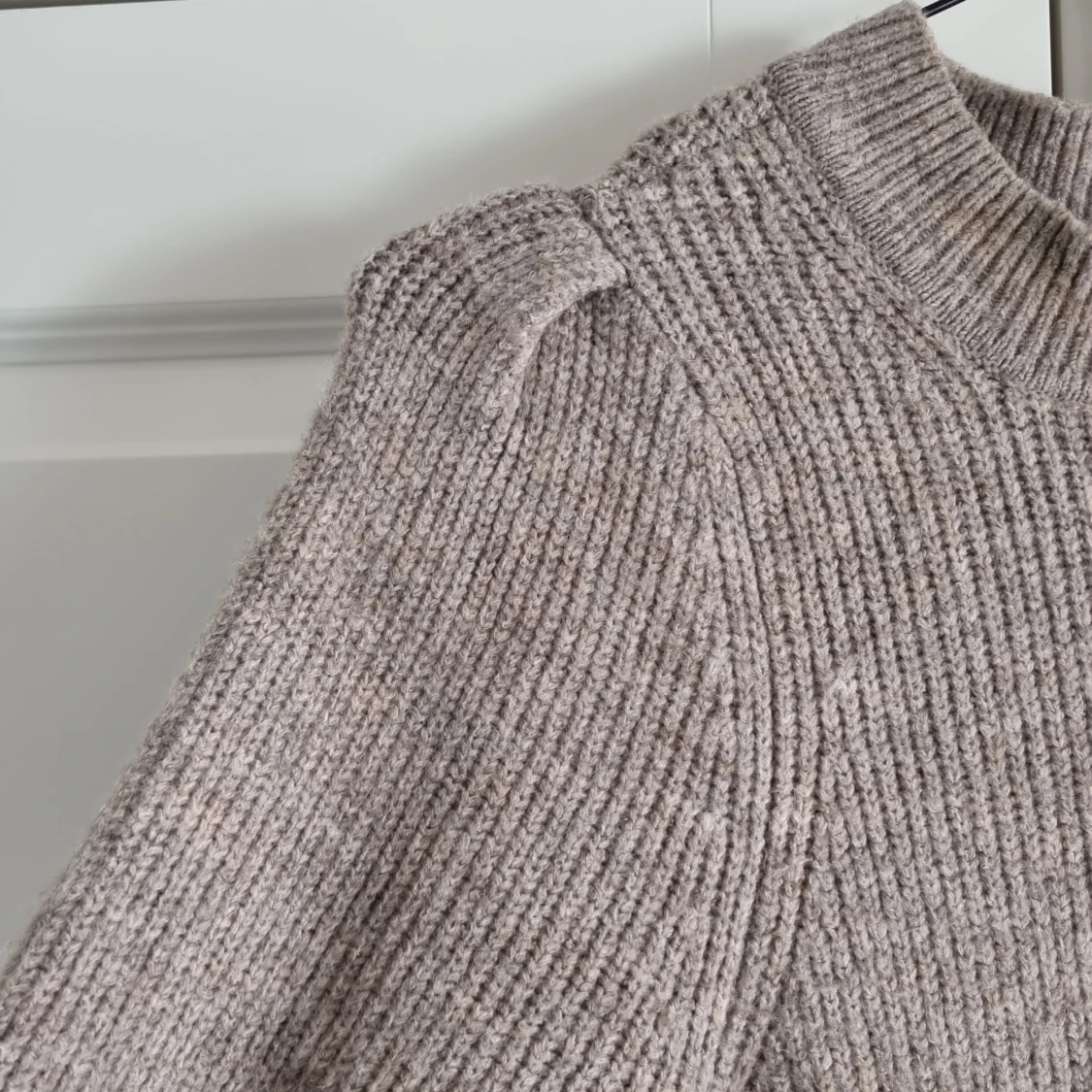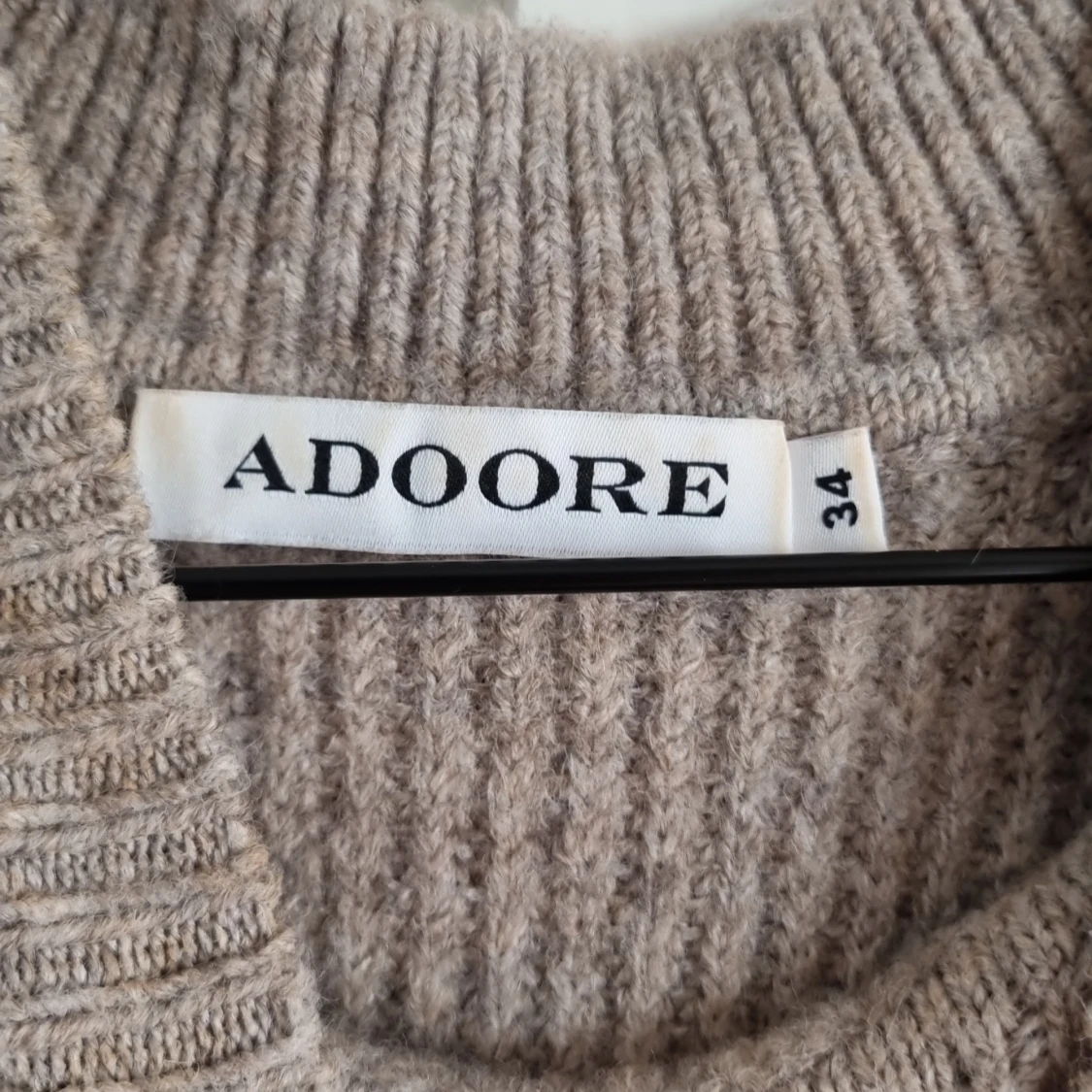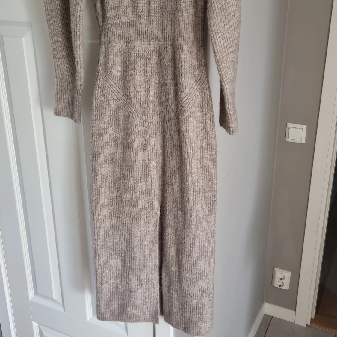 Mysig beige stickad långklänning från Adoore med ribbad struktur, markerad midja och lång ärm. Klänningen har en liten slits framtill och axeldetaljer som ger extra stilpoäng. Perfekt för dig som vill ha en trendig och bekväm look under kyliga dagar. Använd fåtal ggr.