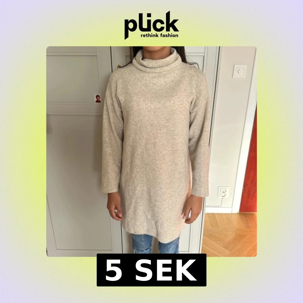 Lång, beige stickad polotröja med avslappnad passform och ribbade muddar. Tröjan har hög polokrage och är perfekt att styla med jeans eller leggings. Enkel och stilren design som funkar året runt.