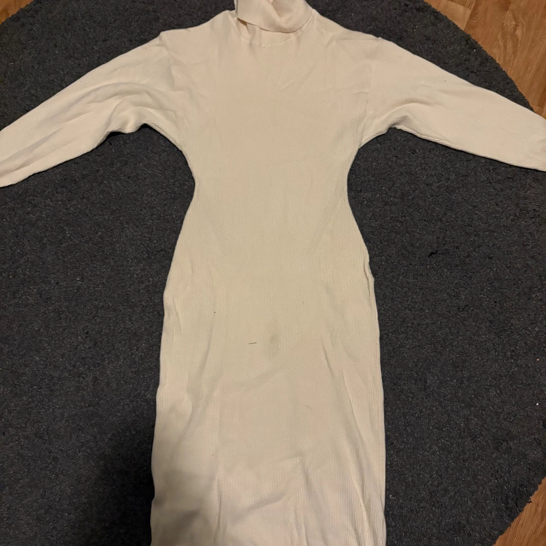 Snygg beige/vit ribbad klänning med lång ärm och polokrage. Klänningen har en liten fläck fram som man kan se på bilderna. Har bara använt klänningen några gånger.