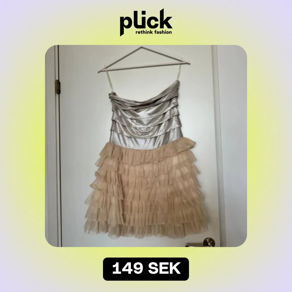 Säljer en superfin klänning med en glittrig silver överdel och en fluffig beige volangkjol. Klänningen har inga axelband och en dragkedja i ryggen för enkel påklädning. Perfekt för fest eller nyår! ✨