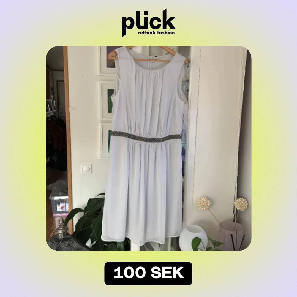 Oanvänd klänning i ljusgrått från Benetton. Storlek L. Nypris 65 euro. Fint glitter i midjan, kan skicka fler bilder