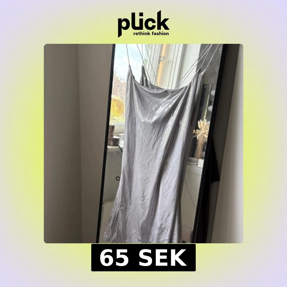 Supersnygg klänning i glittrigt silver med tunna axelband som korsas i ryggen. Klänningen har en draperad urringning och ett mjukt, följsamt tyg. Bandet är något trasigt men går lätt att sy på själv.