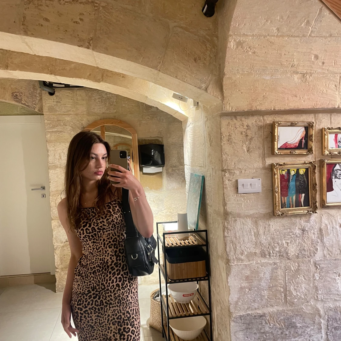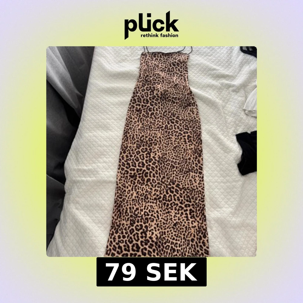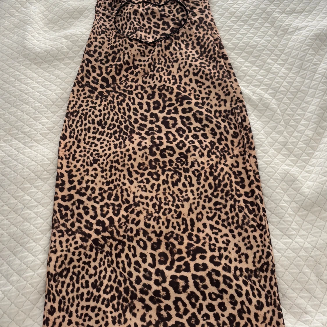 Säljer en snygg långklänning med leopardmönster och smala axelband. Klänningen har en rak och figurnära passform som ger en cool och trendig look.