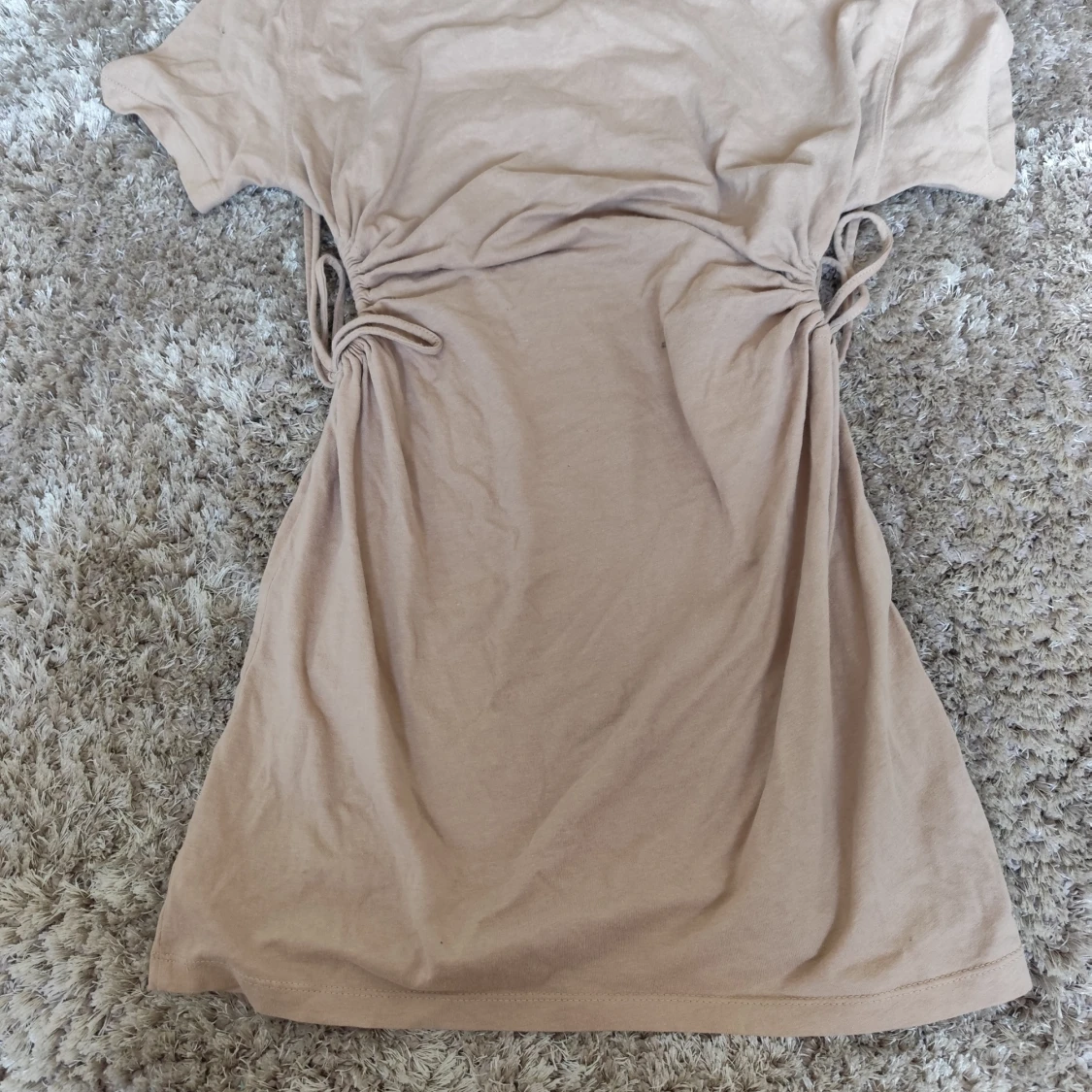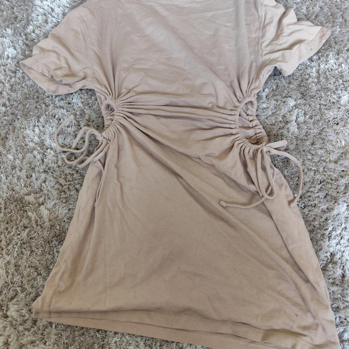 Supersöt beige kortklänning från Bershka med snörning i sidorna som ger en snygg rynkad effekt. Klänningen har korta ärmar och är gjord i mjuk bomull, perfekt för en chill och trendig look.