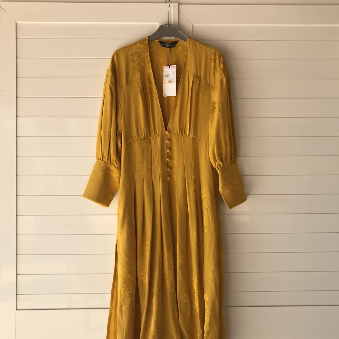Säljer en klänning i kimono-stil med slits i sidan, senapsgul och världens härligaste kvalité. Aldrig använd och lappen finns kvar! Storlek XS/S. Köparen betalar frakten.