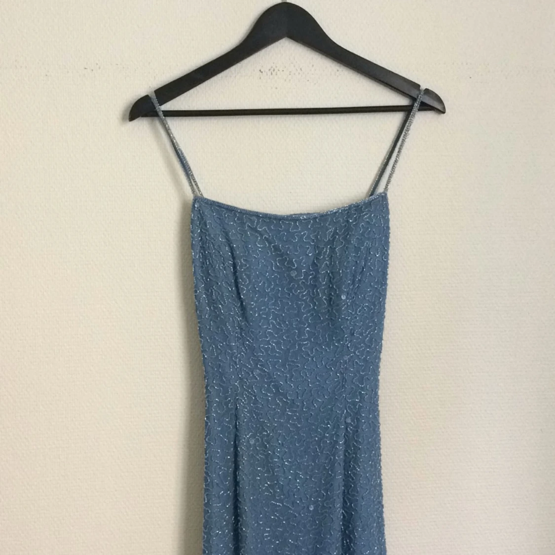 Jättefin balklänning i ljusblått tyg och pärlbroderier på hela klänningen. Slits på båda sidorna. Säljer pgr av flytt och behöver minska garderoben. Köpt på Beyond Retro