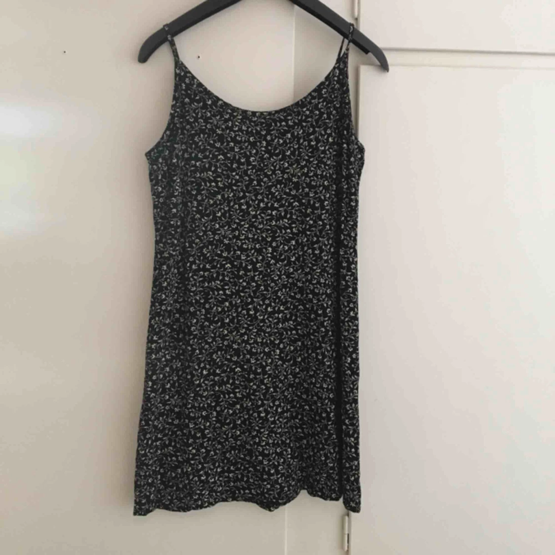 Mörkblå småblommig (vita blommor) klänning i 90-talsmodell i skönt bomullstyg. Väldigt bekväm o mjuk i tyget. Från beyond retro.