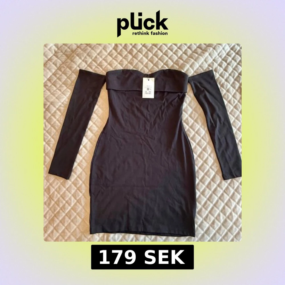 Supersnygg svart offshoulder klänning från Bik Bok i figurnära modell. Klänningen är kort, har långa ärmar och en bred kant upptill som ger en cool och stilren look. Perfekt för dig som gillar minimalistisk och trendig stil.