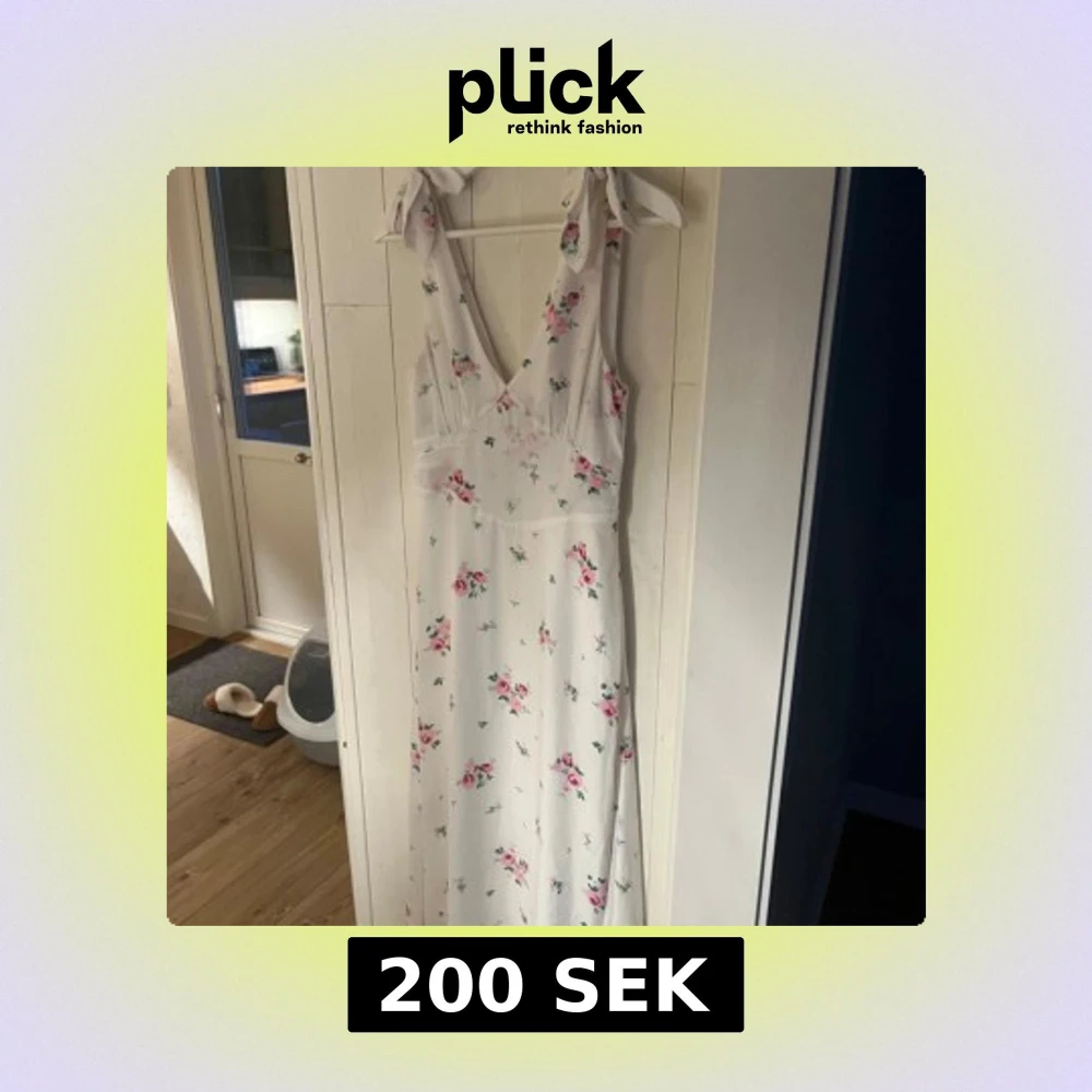 Superfin vit långklänning med rosa blommor, Klänningen har knytband på axlarna. Perfekt för varma dagar och har en flowy, romantisk siluett.