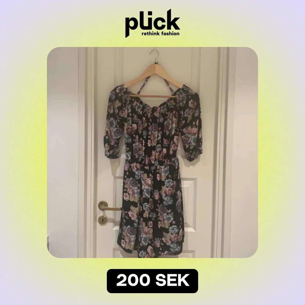 Säljer en superfin blommig klänning med trekvartsärm. Den har en elastisk offshoulder-design och ett vackert blommönster i rosa, lila och beige på en svart bakgrund. Perfekt för vår och sommar! 🌸