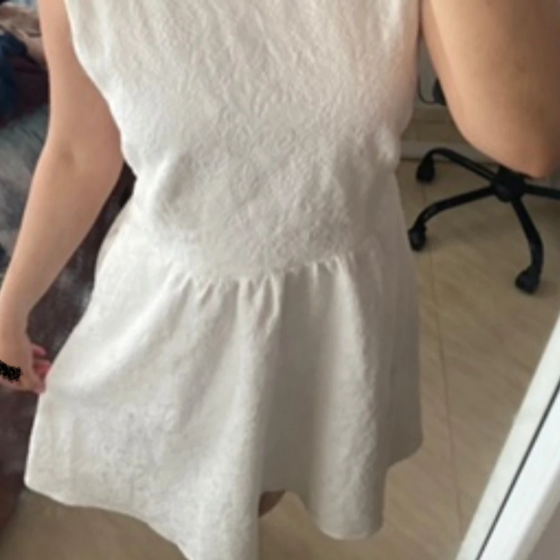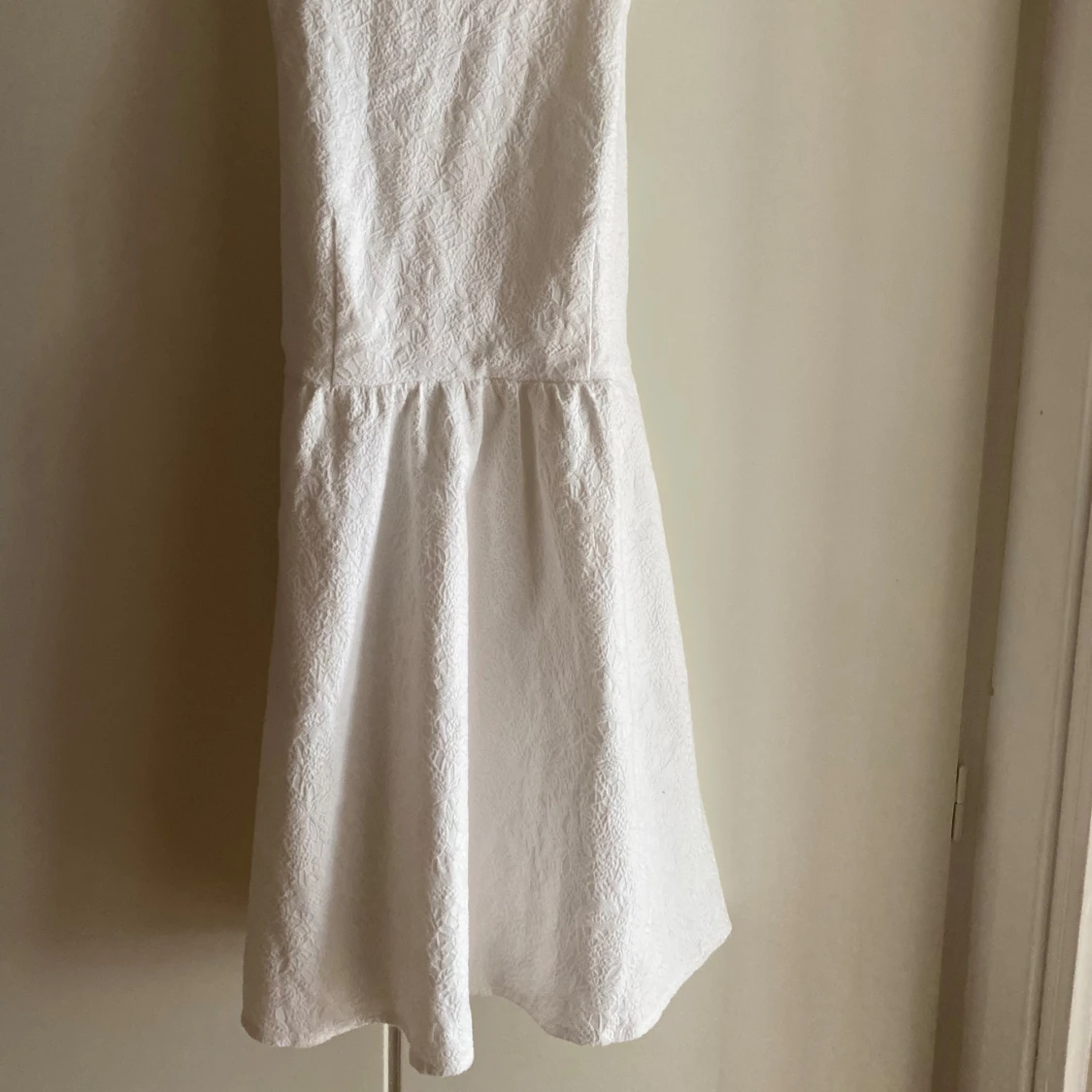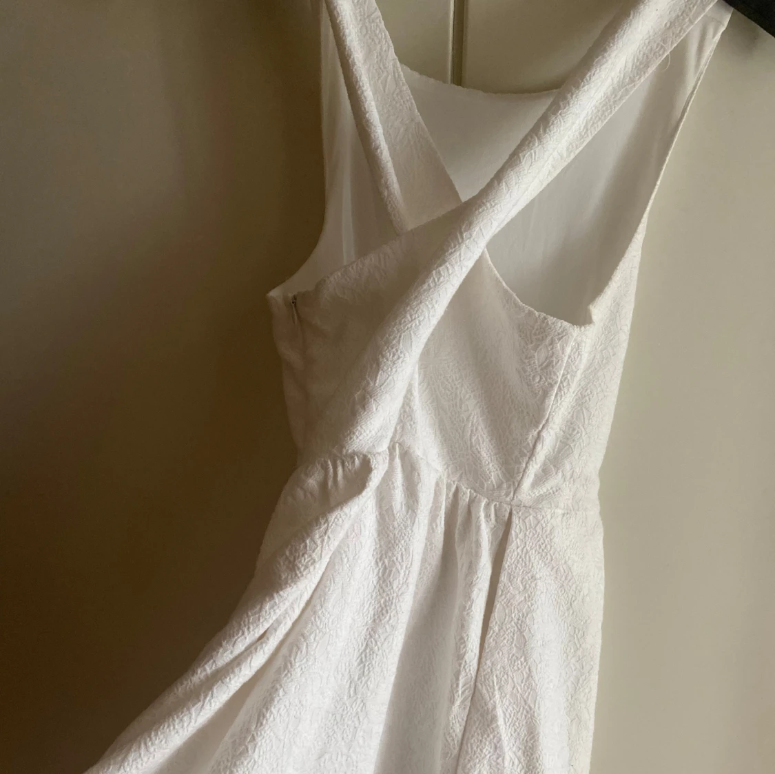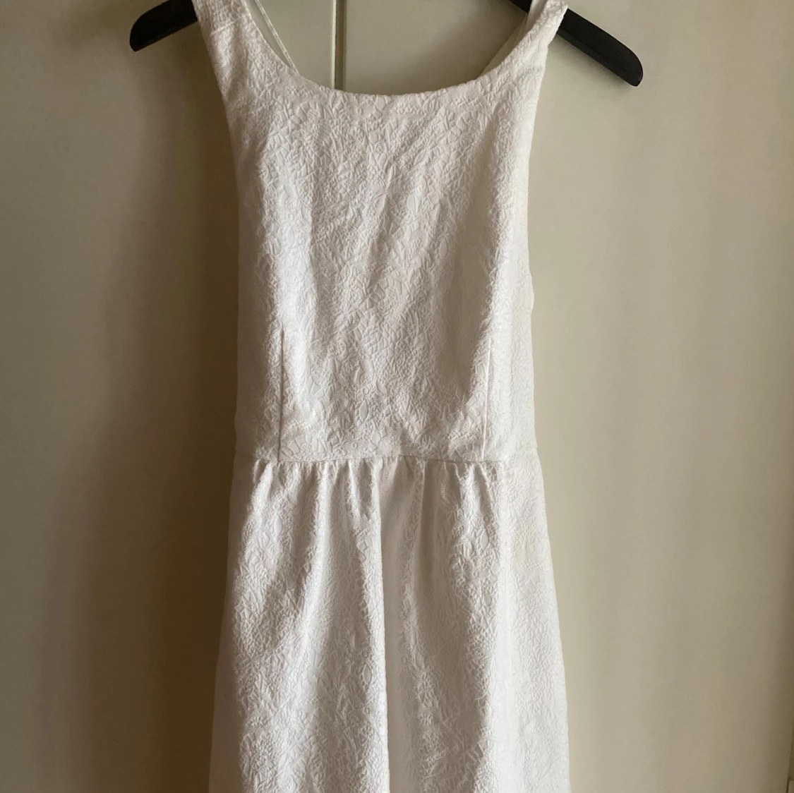 Superfin vit klänning med strukturerat tyg och breda axelband som korsas i ryggen. Klänningen har en lätt utställd kjol och är ärmlös, perfekt för varma dagar. Enkel men ändå elegant design som känns både fräsch och stilren. Använd endast ett fåtal gånger då den inte är min strl! Från bikbok