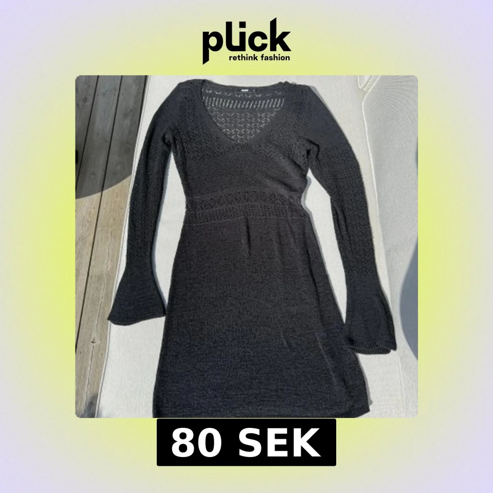 Svart stickad klänning från BikBok med v-ringning och långärmade trumpetärmar. Klänningen har ett fint hålmönster upptill och vid ärmarna, samt markerad midja. Storlek M men är större i storlek.