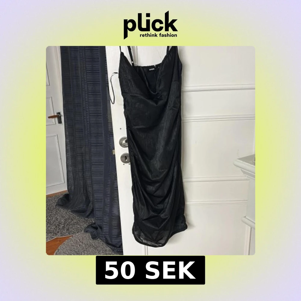 Säljer en svart långklänning från BikBok med smala axelband och lätt glansigt material. Klänningen har en enkel och stilren design med draperad effekt nedtill. Perfekt för dig som vill ha en klassisk och elegant look.