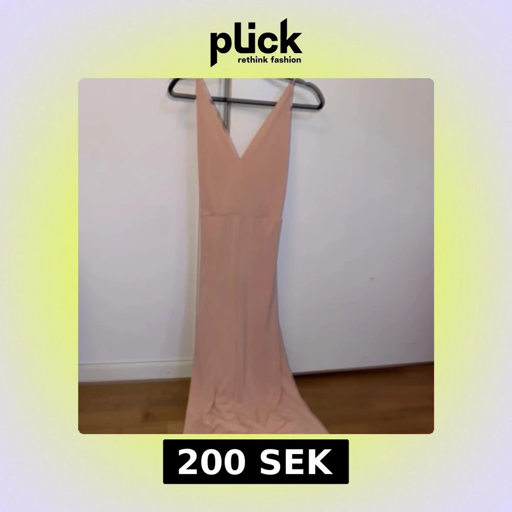 Säljer en elegant champagnefärgad långklänning från Bik Bok med djup v-ringning och smala axelband. Klänningen har en figurnära passform och är tillverkad i ett mjukt, slätt material som ger en lyxig känsla.
