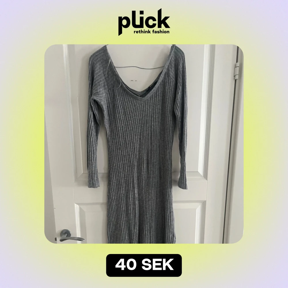 Snygg grå ribbad långklänning från Bik Bok med v-ringning och långa ärmar. Perfekt för en stilren look med en liten slits för extra rörelsefrihet. Passar bra till både vardag och speciella tillfällen.