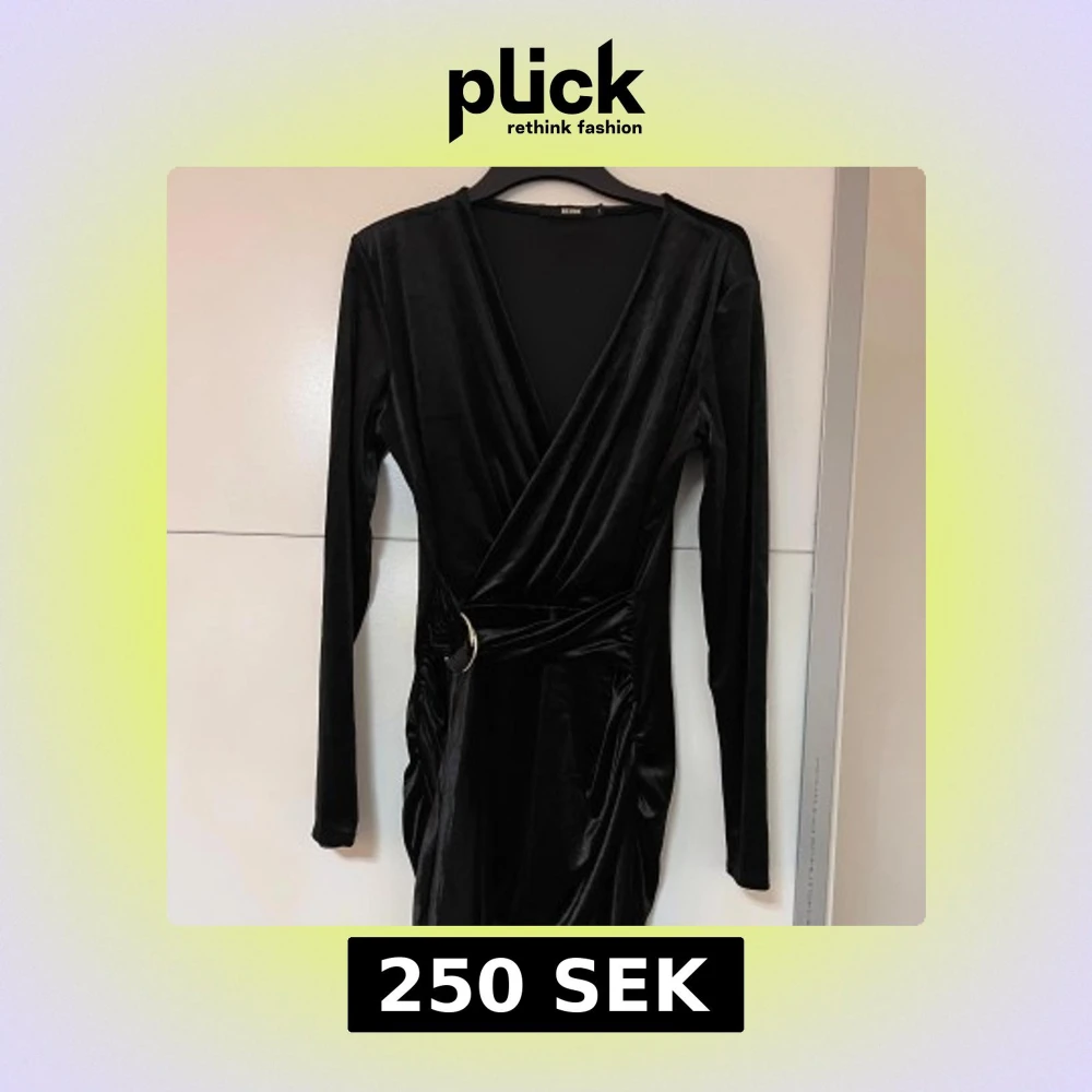 Supersnygg svart sammetsklänning från Bik Bok med omlottmodell, lång ärm och markerad midja med dekorativt bälte och guldfärgad ring. Klänningen har draperad effekt och v-ringad hals.