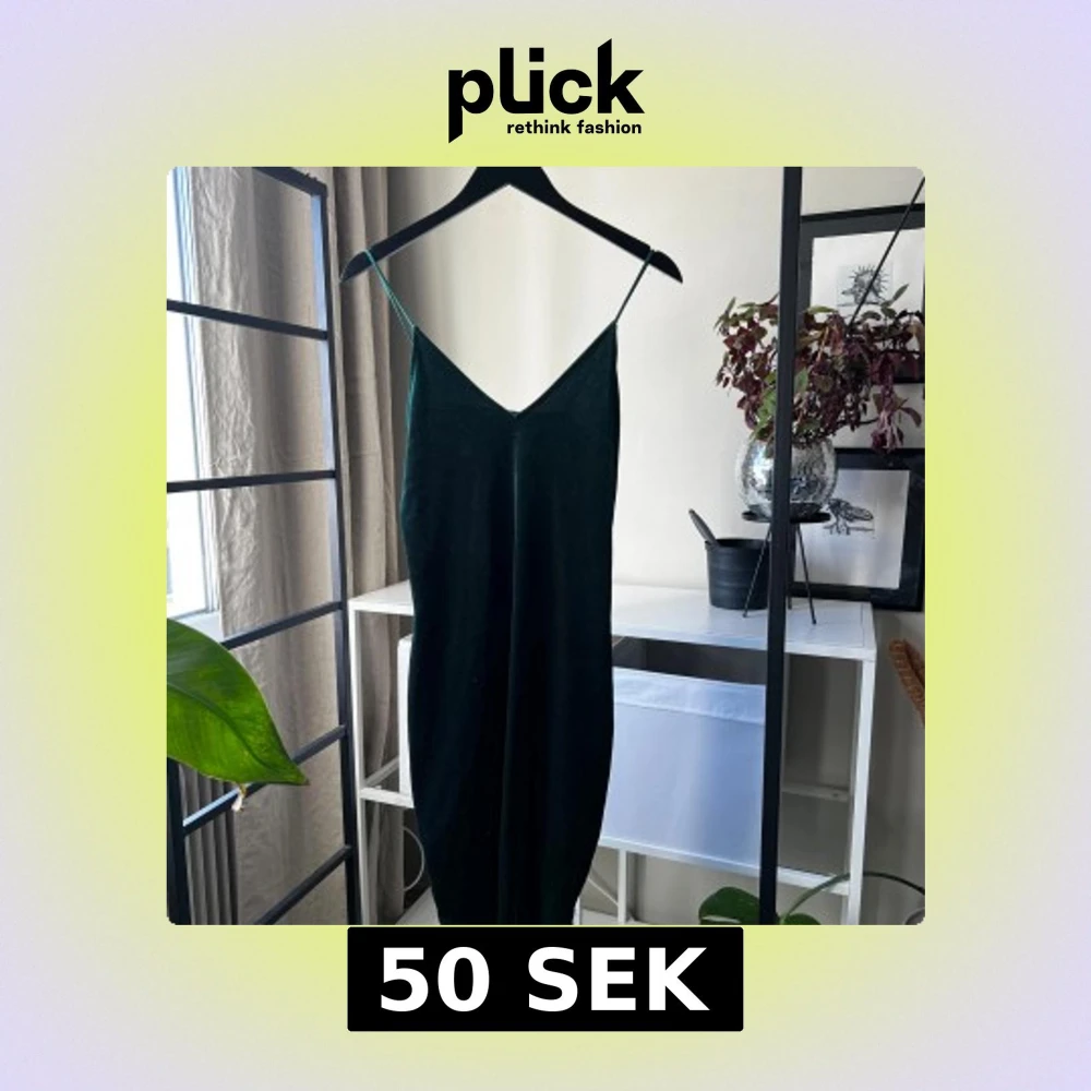 Mörkgrön sammetsklänning från Bik Bok i storlek M. Klänningen har smala axelband, v-ringning och en figurnära passform. Den är ärmlös och har en elegant, enkel design som känns både trendig och klassisk.
