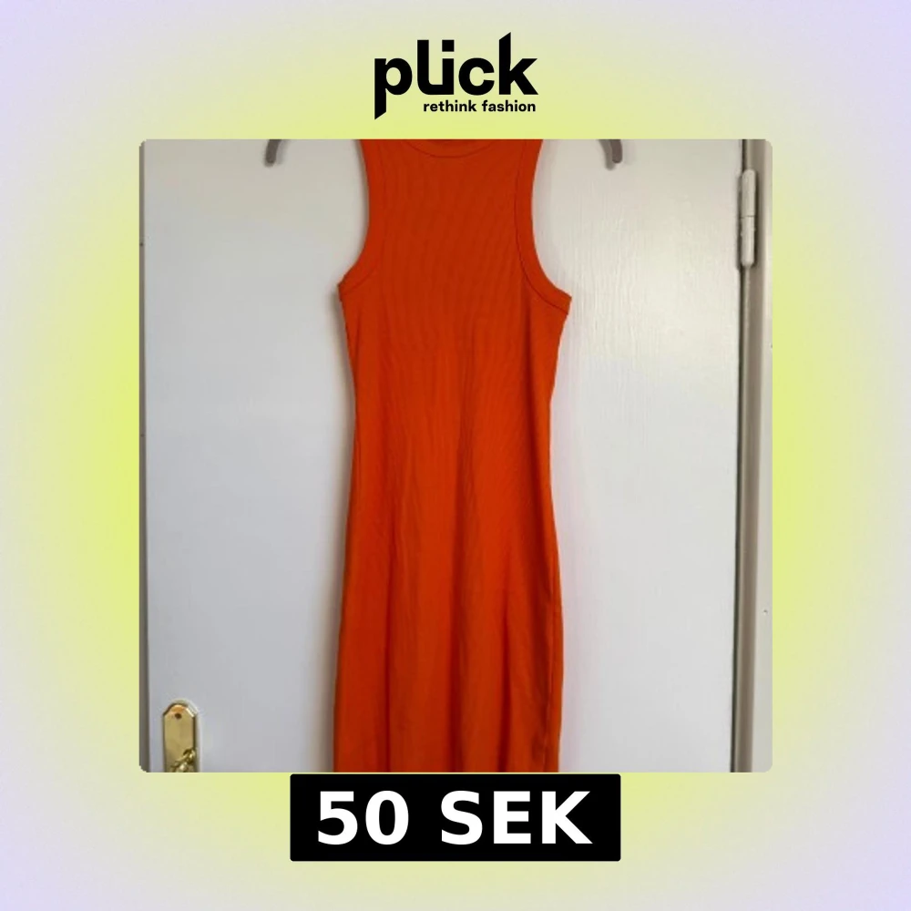 Säljer en snygg orange ribbad klänning med ärmlös design och rund hals. Klänningen har en kroppsnära passform och är perfekt för dig som gillar färgstarka plagg. Materialet är mjukt och stretchigt, vilket gör den bekväm att bära hela dagen.